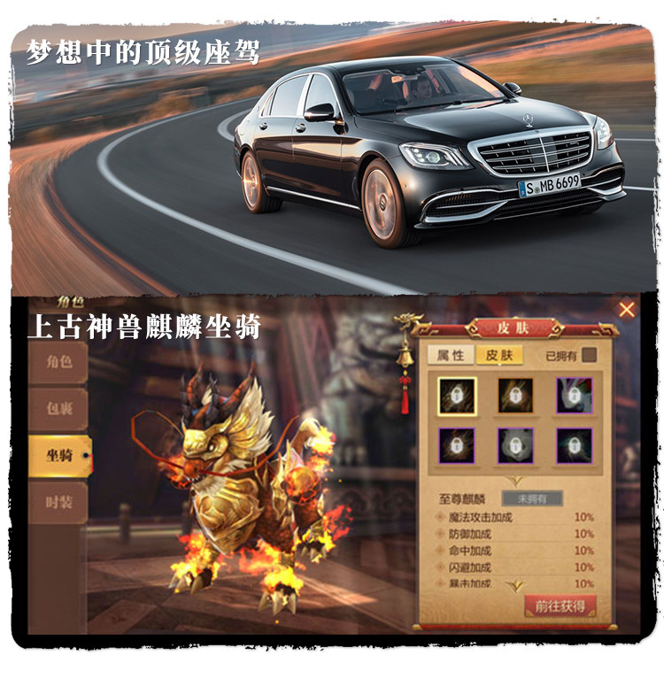 奔驰S级是我们梦想中的顶级座驾,现实中未必能够拥有;也只能寄托于传奇世界3D手游里,我们可以骑着乌骓马征战沙场,甚至可以收服上古神兽麒麟为己所用,君临天下的感觉难以言喻。