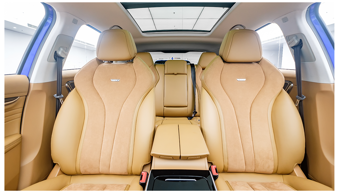荣威MARVEL X车身长宽高分别为4678×1919×1616mm,轴距达2800mm,轴距数据在同级别中占有优势。MARVEL X的座椅采用了Alcantara和小牛皮拼接而成,质感不赖,而且座椅设计较合理,能给人体带来不错的支撑性。后排地台更是全平的,能让乘客拥有更舒展的乘坐姿势。