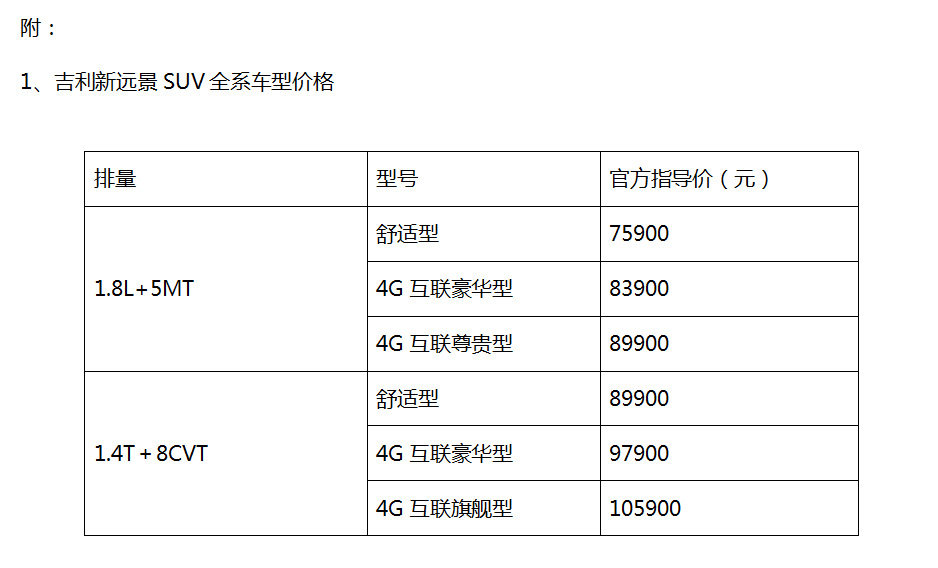 新设计——新增钛晶灰和中国红,造型简致时尚。新远景SUV整体造型继承了吉利全新家族化设计基因,悬浮式水滴涟漪前格栅更突显吉利家族化脸谱设计特色。流线型线条贯穿整个车身,搭配蝶翼式铝合金轮毂、LED丝带雅熏后尾灯等全新设计语言,将整体造型打造得更具简约时尚气息。此外,新车新增中国红和钛晶灰配色,更具活力与高级质感。