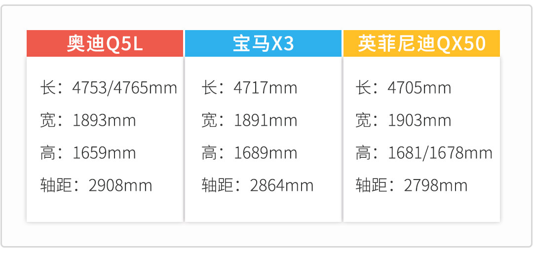 尺寸方面,三车的长宽高没有太多可圈可点的,都是同级比较标准的水平,但轴距方面,奥迪Q5L就体现出了一定的优势,相比之下,英菲尼迪QX50就要显得比较逊色了。