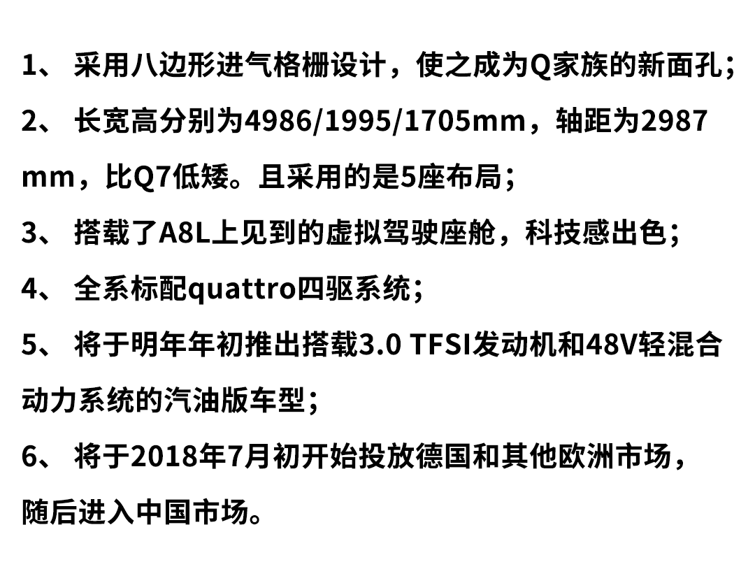 作为奥迪全新旗舰级SUV,奥迪Q8可谓是集霸气外形、运动性能、智能科技于一身。新车亮点多多,而最重要的是以下几点: