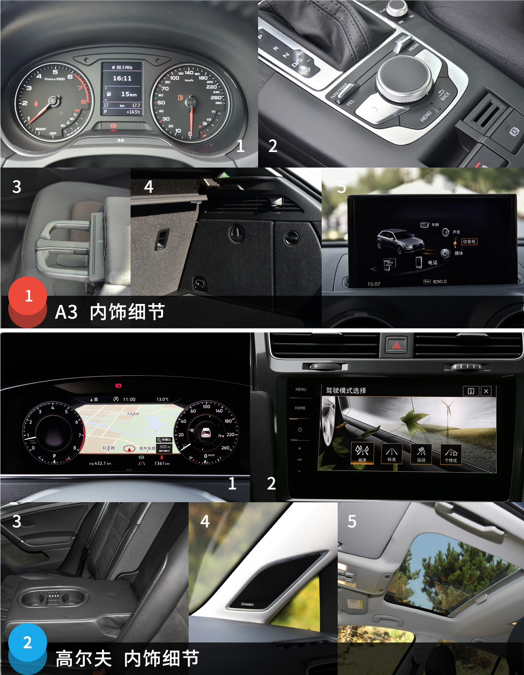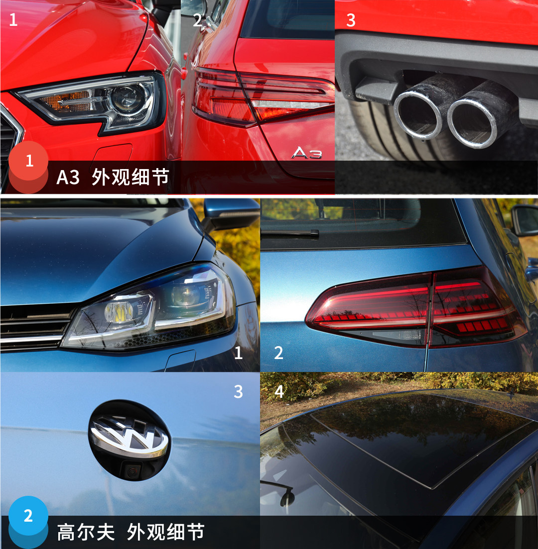 在细节上,由于是高配车型,高尔夫的全LED大灯和熏黑的全LED尾灯点亮效果更胜一筹,隐藏在尾标的倒车摄像头也很显档次;而A3虽然是全系最低配,但标配的氙气大灯、LED尾灯、17寸轮毂等不会让人有太多的高低配落差感,这点还是比较照顾咱低配用户的面子。