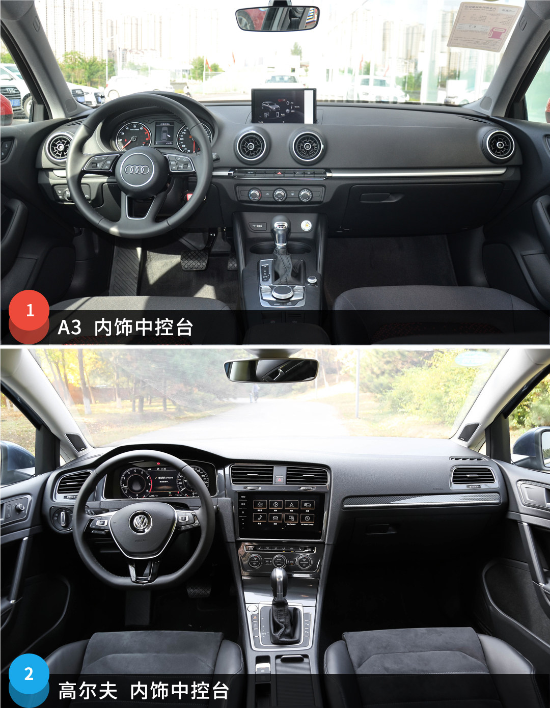 在中控台设计方面,A3的设计更为简洁运动,整体与高配车型差异不算太大,例如可升降的中央显示屏、MMI操作系统、多功能方向盘等都作为全系标配;高尔夫则是再熟悉不过的“大众”风格内饰,没什么亮点,但胜在好用耐看,其顶配车型在配置和材质运用上更为讲究一些,对比于A3低配的“素雅”,其高档感也要更好一些,不过在整体用料和做工水准上,作为豪华品牌的A3,在水准上要更优一些。