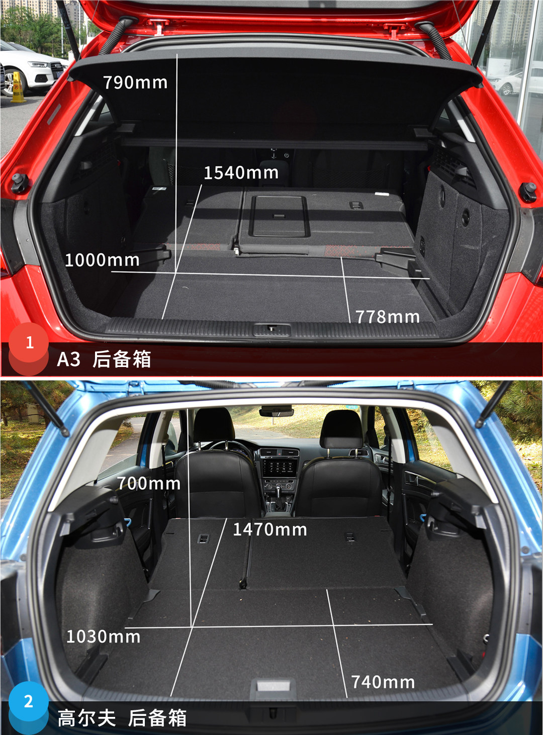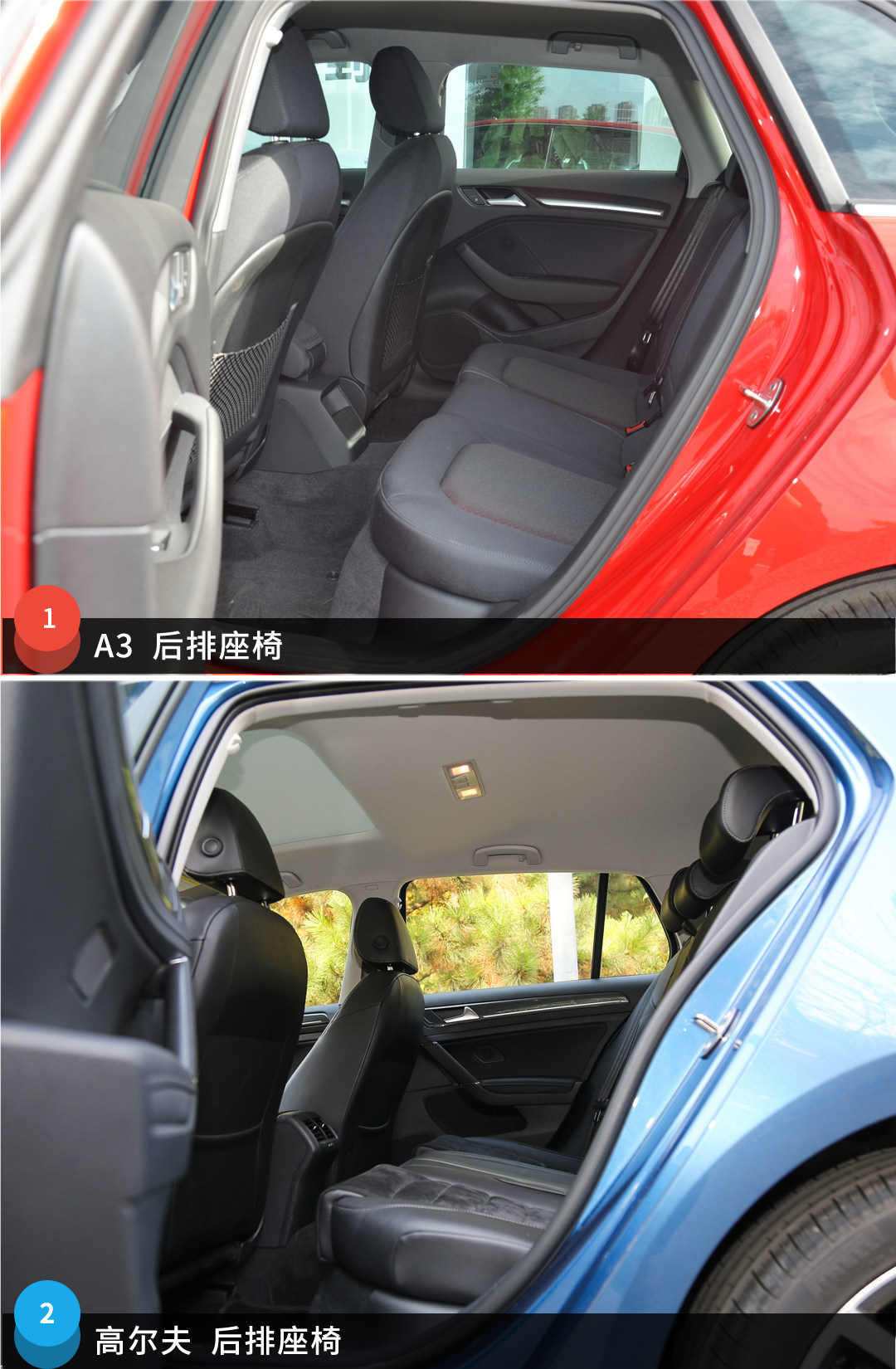 两者后排座椅都可以4/6放倒进行后备箱空间拓展,高尔夫后备箱的规整度更好,而A3则在做工用料等人性化细节方面表现更优异。