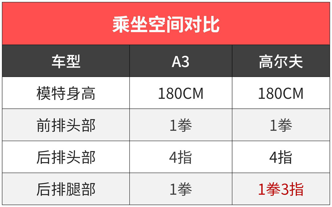 在空间表现上,高尔夫除了后排腿部稍占优势,其它方面两者均表现一致。