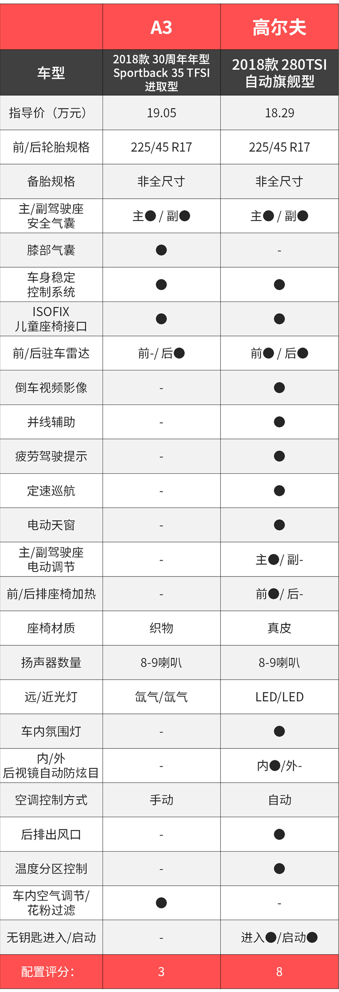 这两款车型虽然在指导价或者终端优惠价都非常的接近,但各自的特点还是非常明显的:高尔夫在配置上的做得更加贴心全面,日常使用也更加便捷,而且在驾驶层面也更有乐趣一些;A3品牌光环明显,并且在各种细节处理上更显水准,轻松舒适的驾乘感受相信也能迎合大部分消费者的胃口,不过配置偏低以及后期养护成本高也是需要注意的方面。