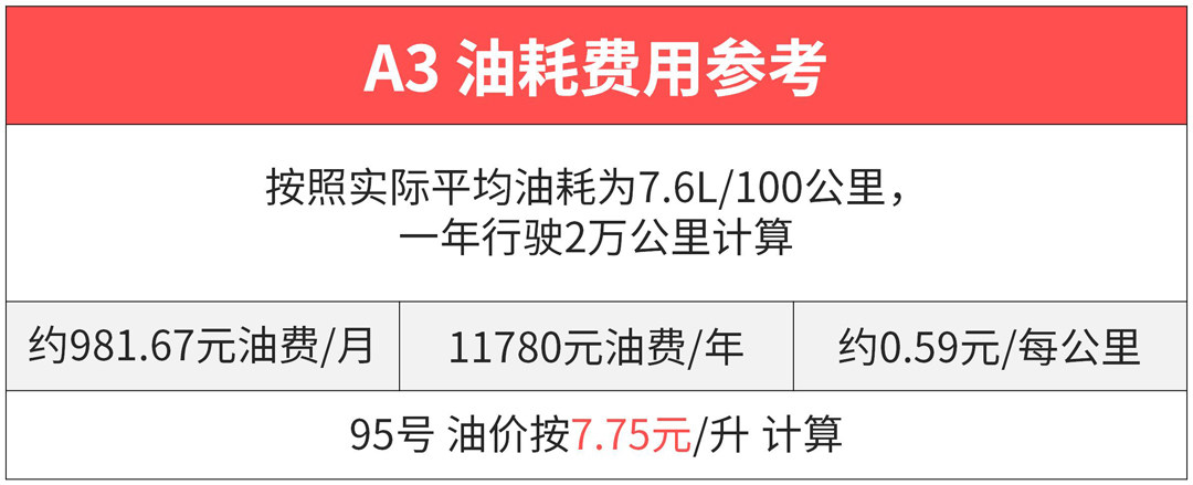 通常买豪华品牌要作好高后期养护成本的心理准备,即便是家族中最入门的A3,养起来也要比同门的高尔夫贵上不少,例如在相同的一万公里保养里程上,A3则要比高尔夫贵出1倍多;而根据车主提供的真实平均油耗,A3也要比高尔夫高出一些,相应的油耗费用也会增加。
