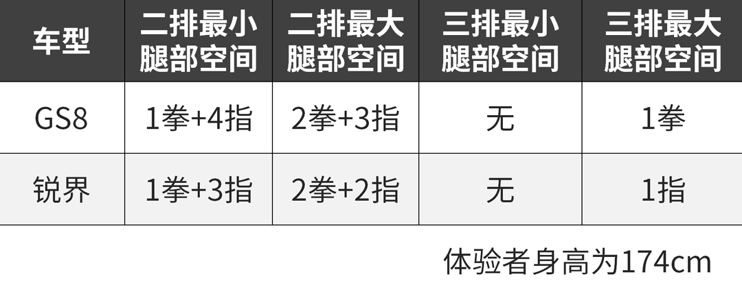 从上面的对比表格能看到,GS8在二排腿部空间上要比锐界出色不少,同时第三排的实用性明显更高。GS8的二排中央地板凸起不高,前后留了充分的空间,放脚颇为便利。座椅造型契合一般国人身材,填充物也较为柔软舒适。