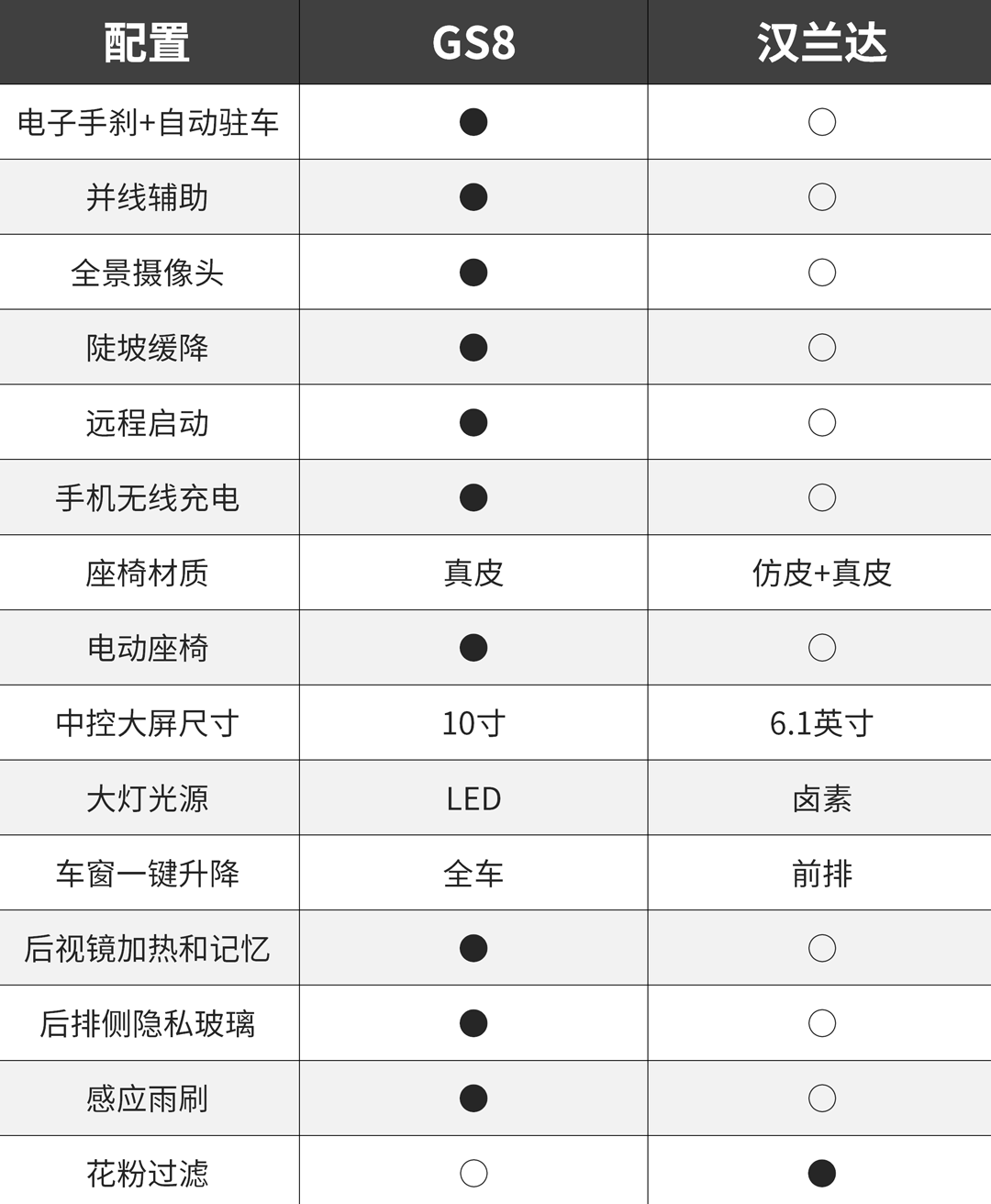 中国品牌的车型在配置方面从来没有令人失望,GS8的指导价为16.38-25.98万。其中,主推车型是传祺GS8 320T两驱豪华智联版(指导价18.28万),我们不妨拿这款车与汉兰达 2018款 2.0T两驱豪华版7座(指导价为28.98万)进行一下配置对比。