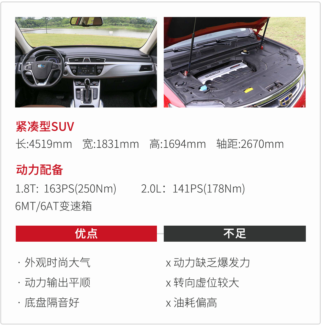 博越虽然有1.8T和2.0L两款发动机,但是2.0L配的是手动变速箱,而1.8T则有6AT变速箱可选。不过,1.8T+6AT这套动力属于油老虎的类型,两驱车型的工信部油耗为7.8L/100km,四驱车型则去到8.2L/100km。