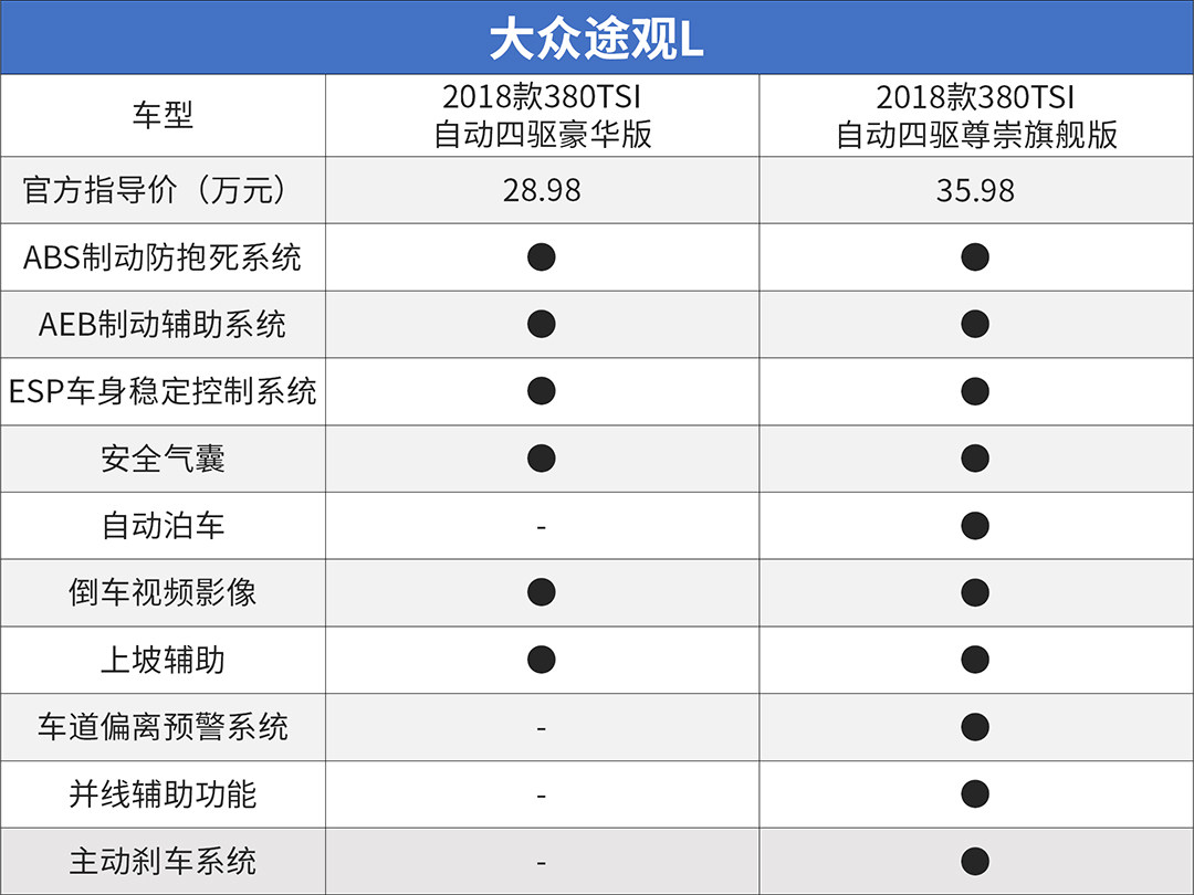 途观L在加强车身材质刚度的同时在车辆安全配置上进行普及,入门车型基本配置了刹车辅助、EPS车身稳定系统等配置,在高配和顶配车型上则配置了国内车型比较少见的车道偏离预警系统、主动刹车系统和并线辅助功能等配置,不过,在售价上配有主动刹车系统这些的要比没有的高出5-6万左右,整体车辆售价高不少。