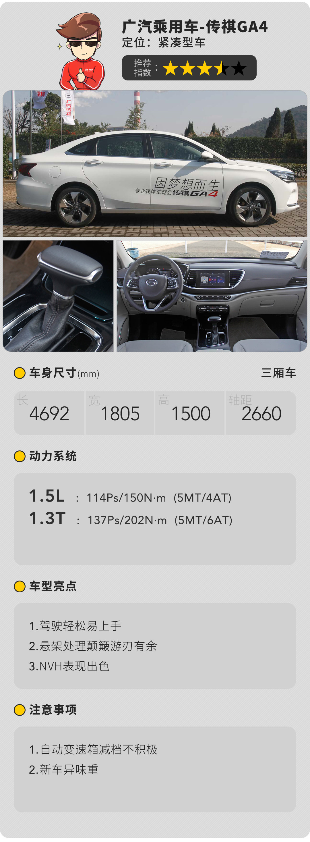 1.3T发动机也是家族的传家宝在GS4,GS3身上都能看到,也并没有做什么技术的革新,用的还是多点电喷,不过和爱信的6AT搭配起来日常行驶平顺,市区加速也不会明显气短,对于家用而言也足够了,扣分项在于家用角度来说悬挂调得过硬对于连续颠簸处理上不够聪明。