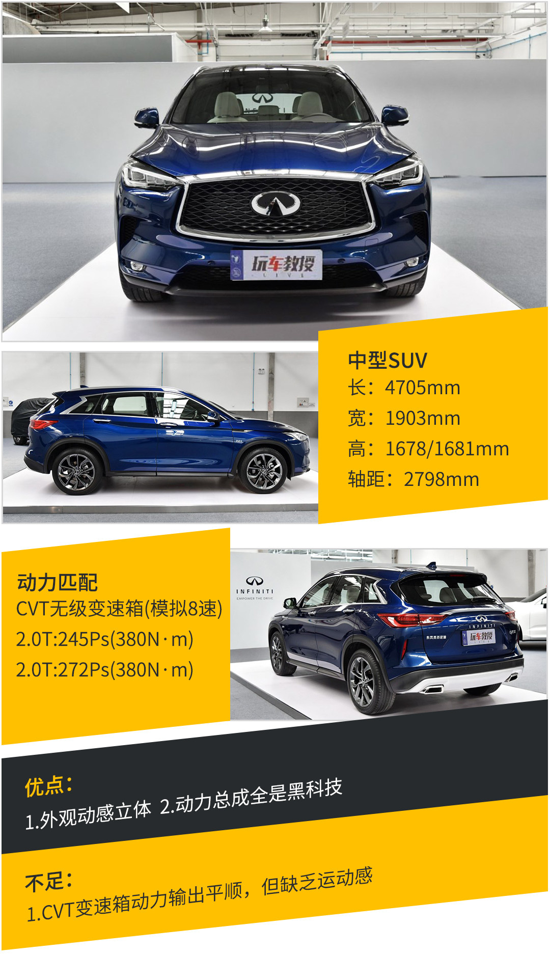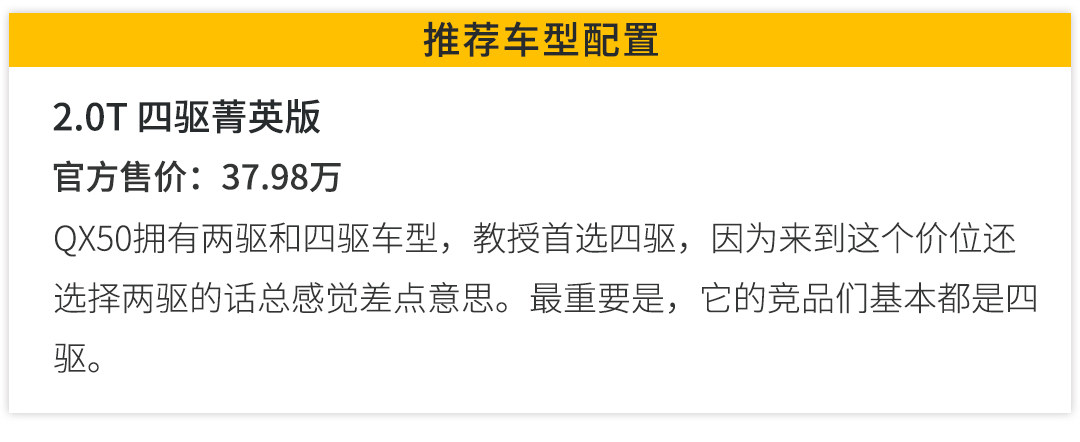 起步价低于旧款QX50,这并不让人惊讶,虽然动力从2.5L V6变为2.0T L4,但是考虑到平台上的 “降格”以及英菲尼迪必须用这款车型重新打开国内市场的决心,目前这个价格也算是相当有“诚意”的。东风英菲尼迪也应该认识到,全新QX50如果能在国内做好,事实上可以比目前在售的Q50L带来更大的销售、利润和更高的品牌形象。