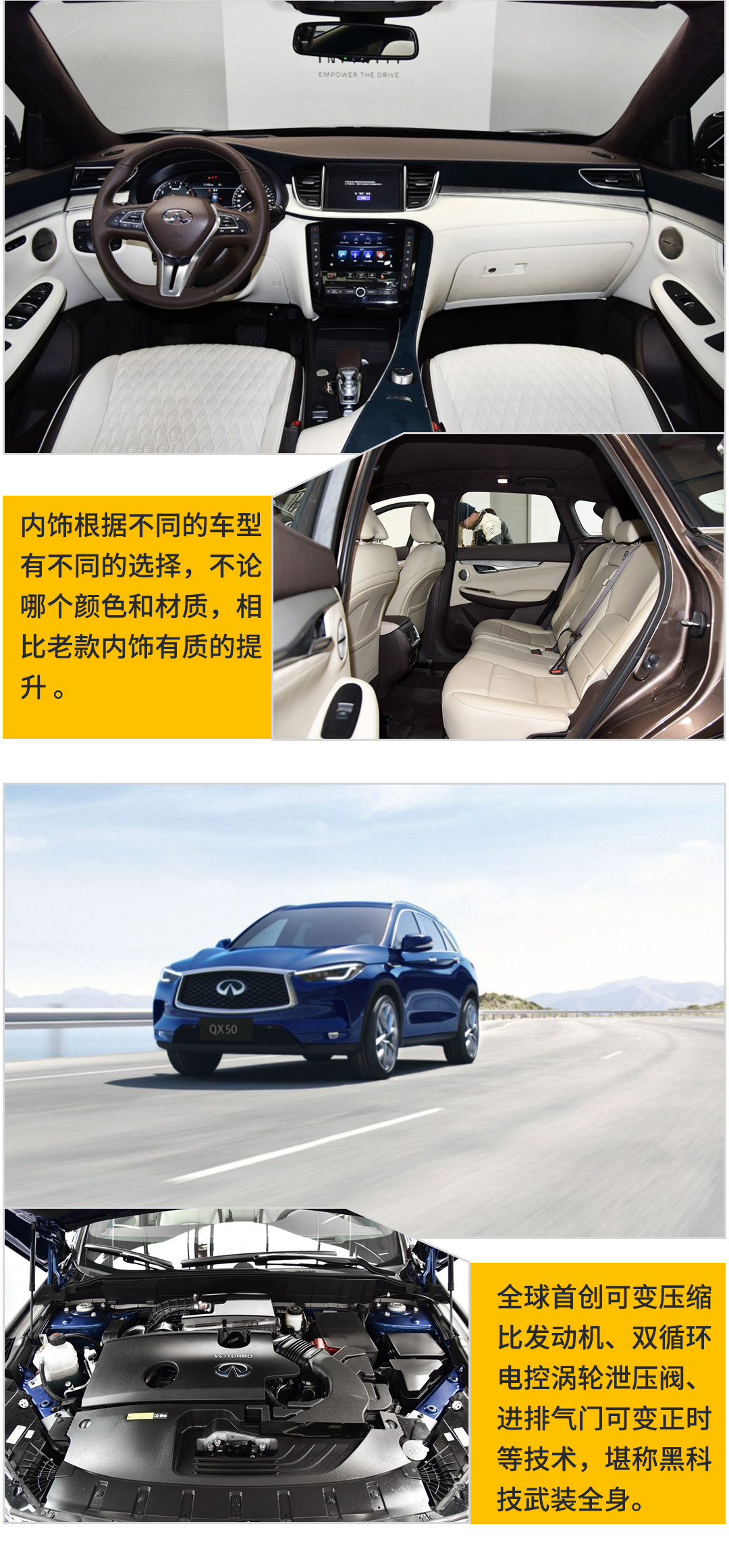 作为换代车型,基于全新整车平台打造的新款QX50换装了一套全新的动力总成以及底盘结构。2.0T可变压缩比的发动机分高低功率版本,并且均搭配模拟8速的CVT变速箱。这台发动机可以说是这次QX50的所有精髓,可以实现8:1-14:1区间的压缩比调节,有助于提升发动机不同工况的燃烧效率,从而降低油耗。