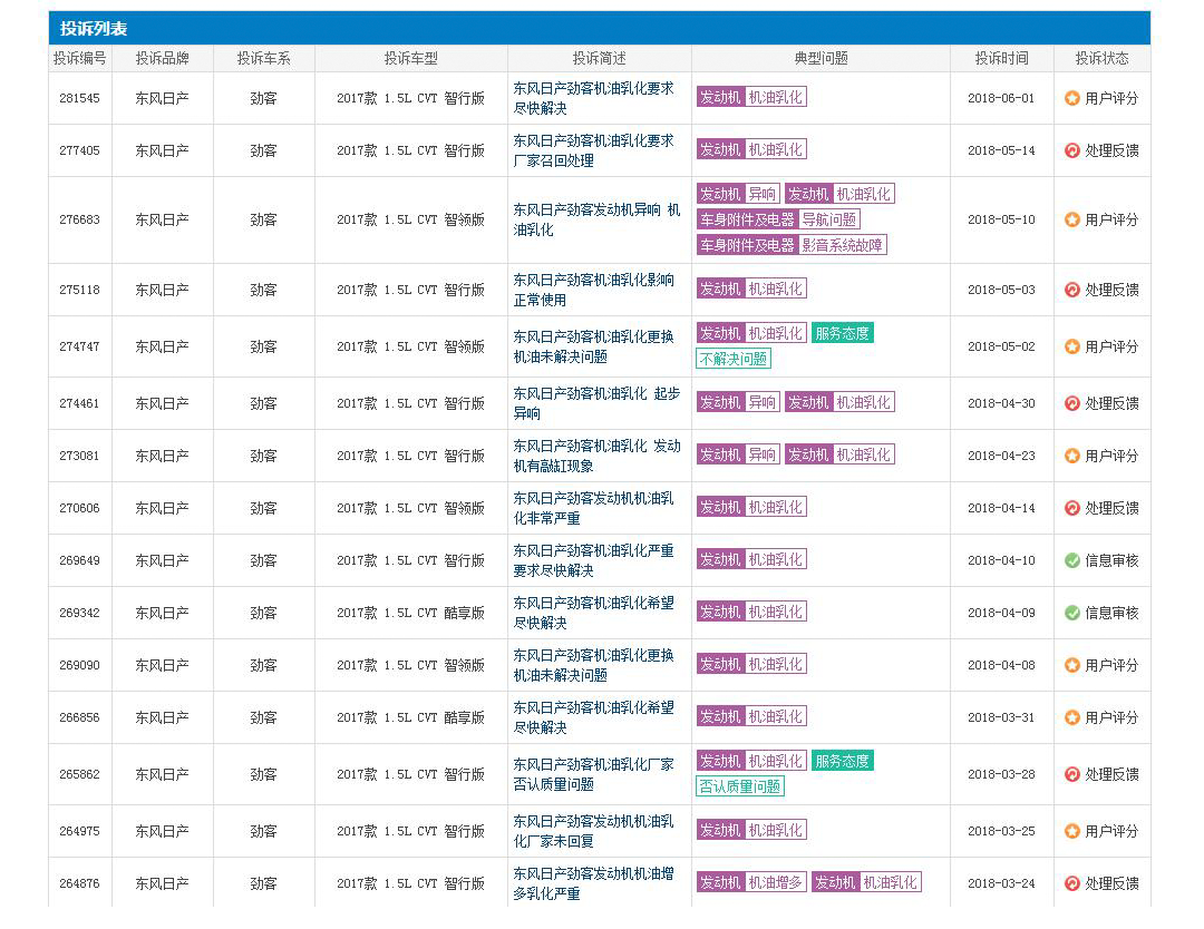 上市之初,劲客在2017年年末还达到过破万的月销成绩,可是好景不长。上市没多久的日产劲客质量问题频发,其中发动机的机油乳化问题尤为严重。2018年以来车质网上机油乳化的投诉一不少,其他如机油增多、刹车泵故障等问题也存在。