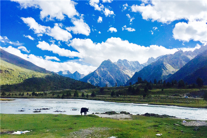 ▼新路海-雀儿山下,一只牦牛正悠闲的河边吃着草。