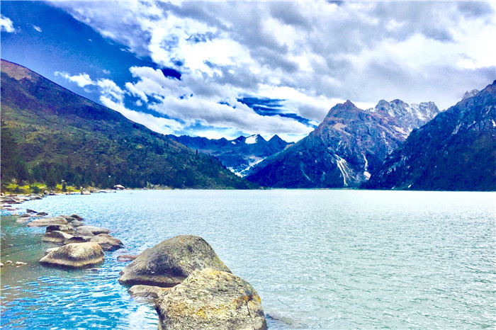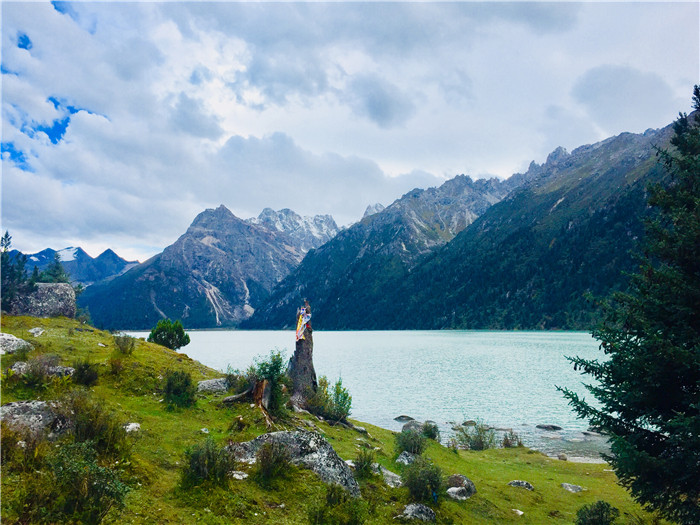 继续前行七八公里,国道左侧一条岔道开下去约摸一分钟,就到了美丽的玉隆拉措,也就是车友们常提起的新路海,这还是筑路大军当年修筑川藏北线时给起的名字。相传,藏族英雄格萨尔王南征北战时途经玉隆拉措,他的爱妃珠姆来到湖边,被雀儿山下这秀丽的湖光山色深深吸引,痴立湖畔久久不肯离去。后来珠姆被霍尔王抢去,一天,珠姆孤身一人来到湖边,却再也不见格萨尔王,她对着湖面深情地喊着“玉隆、玉隆”,对格萨尔的眷念之心仿佛也沉入了这深深的湖底。在藏语中,玉隆是心丢失的意思,无论珠姆走到哪里,她的心儿都永远留在了这里,为格萨尔守候。后人为了纪念珠姆,遂取名为玉隆拉措。如果你选择川藏北线进藏,那这个美丽的海子是绝不容错过的。进了景区大门,翻过两座不高的土坡,步行约摸十五分钟,你就能看到静静伫立在雀儿山雪峰脚下的这个宁静的海子了。在我的印象中,这还是我旅行生涯中第一个如此轻易就能到达的海子。