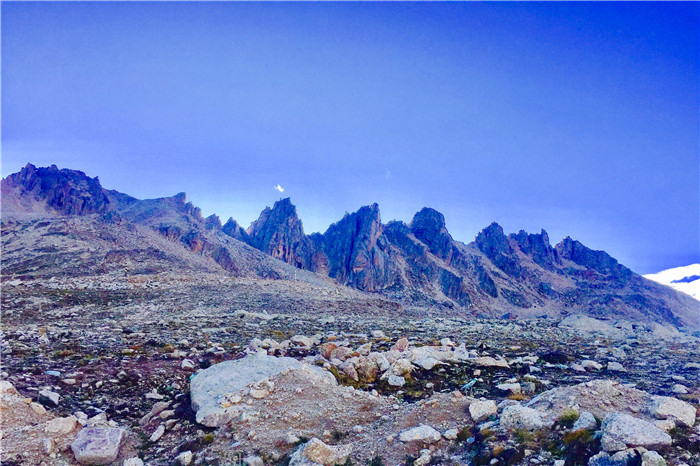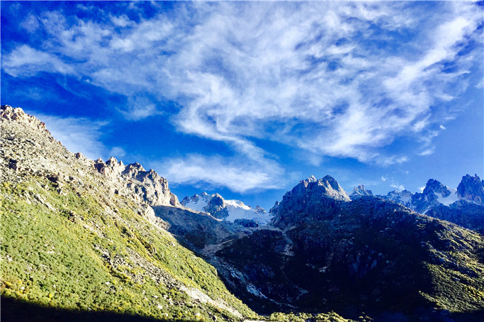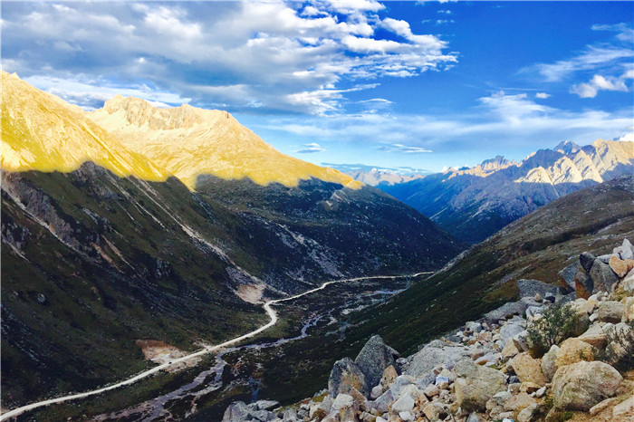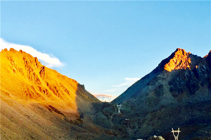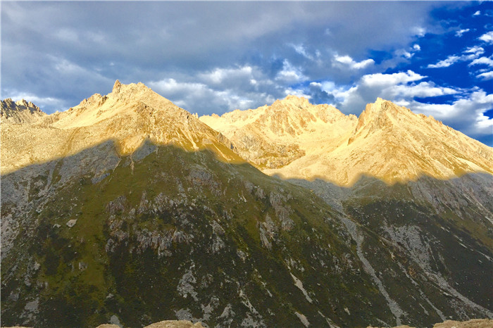 ▼雀儿山-山色雄浑,更高的山峰投下的阴影笼罩在对面的山峰之上。