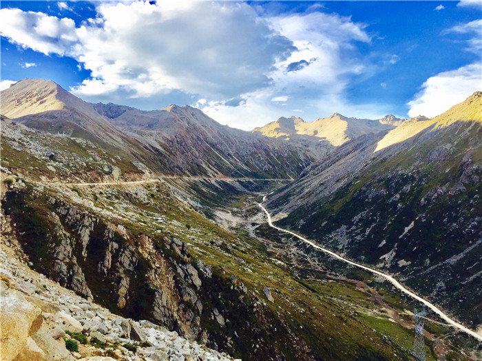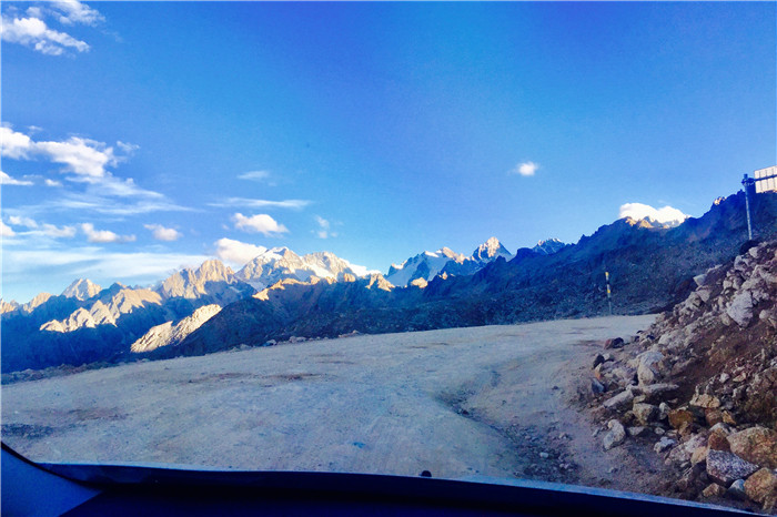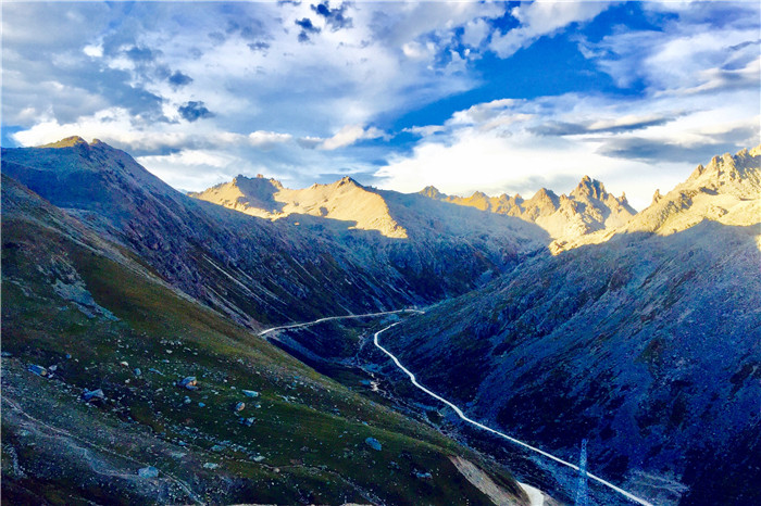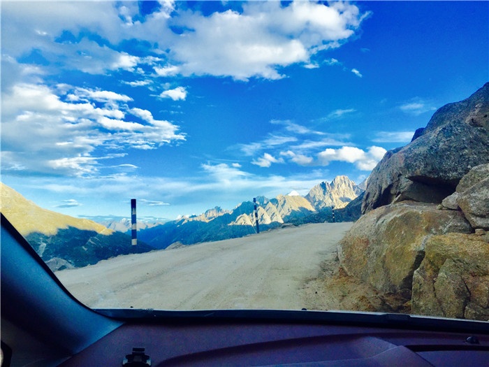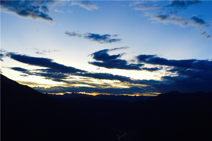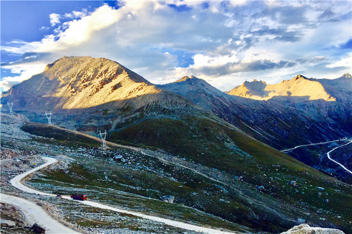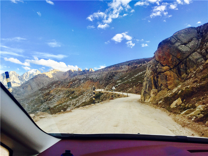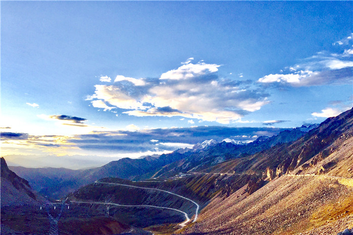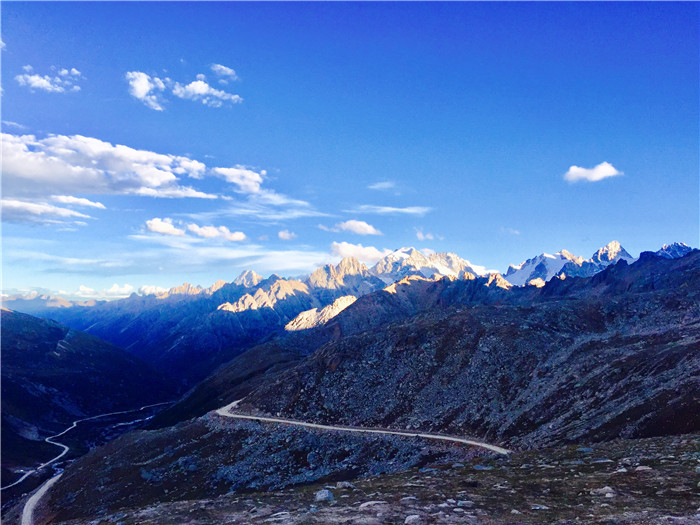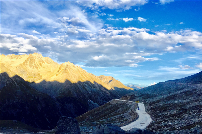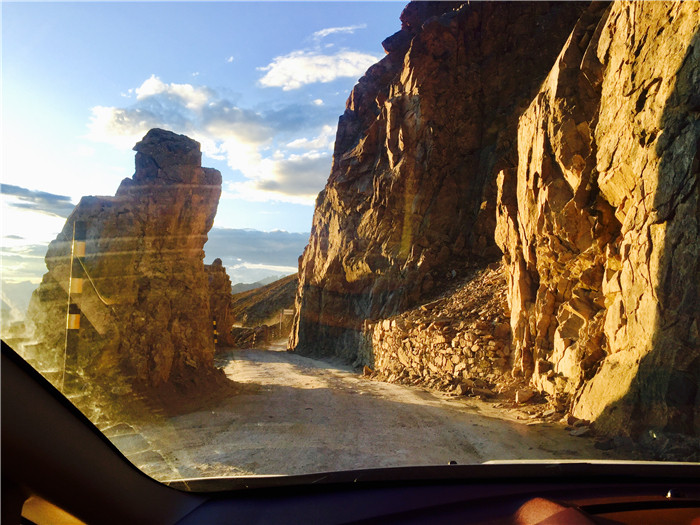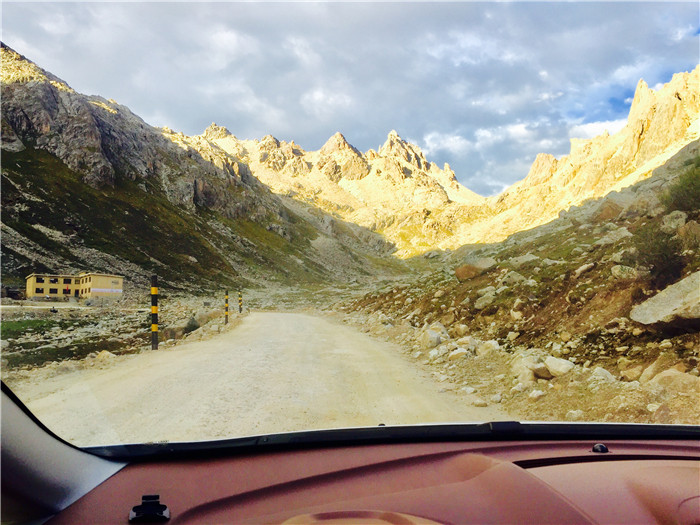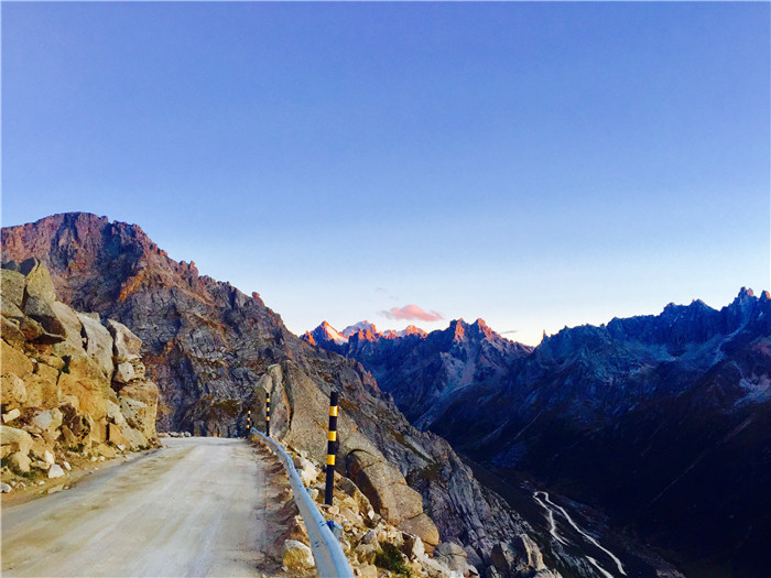 上山的路难走,全程单车道、碎石路,道路起伏不定陡峭难行,部分路段有护栏,部分路段只有警示悬崖的立柱,还有部分路段无任何保护措施。整整五重盘山路才最终爬上垭口,前所未见,即便我这个有着二十一年驾龄的老司机,开起来也不禁有点胆战心惊,这一个不小心就是车毁人亡啊。从碎石路算起,全程28.5公里的盘山道,我们整整开了两小时,很多路段只能五迈、十迈的小心往前蹭。如果隧道通的话,估计最多八分钟。下到半山腰的时候,天就已经黑透了,才开始后悔在玉隆拉措耽误了太多时间,早要知道隧道不通就该早点上山才对,也不至于摸黑走在这么危险的山道上。在这条艰险的盘山路上,我们第一次见到了日照金山,这也算是上天给予我们的馈赠了吧。