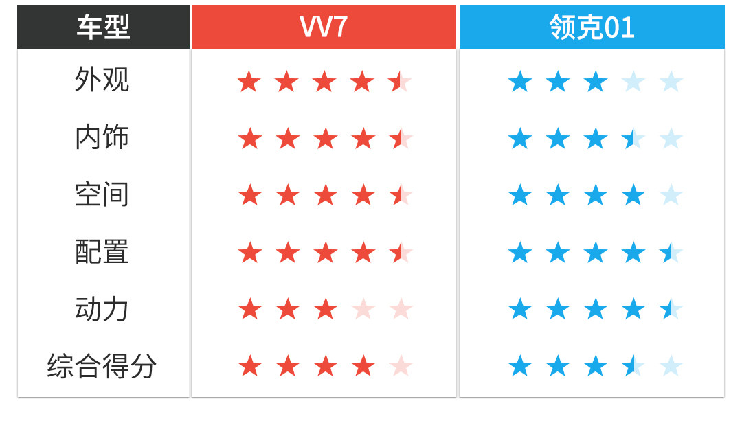 自从3月份领克01的销量反超VV7开始,领克01的月销量已经连续3个月领先VV7,这一状况还将会继续一段时间,这也为接下来的对比埋下了伏笔。