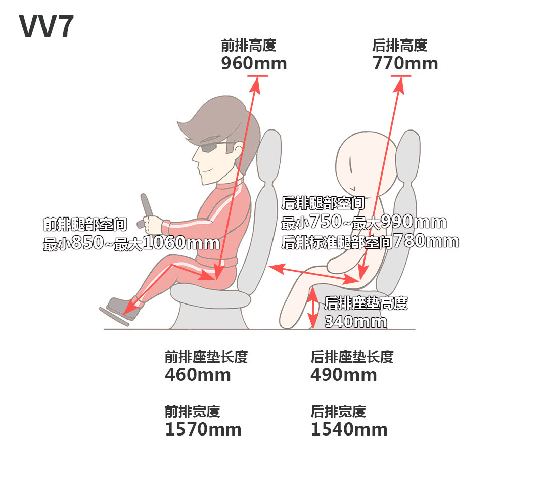 在车身尺寸的硬性指标上,VV7的长,宽和轴距都比01要长,只是在高度比01少了接近20mm,那么就实际乘坐空间上又是如何,我们接着看。