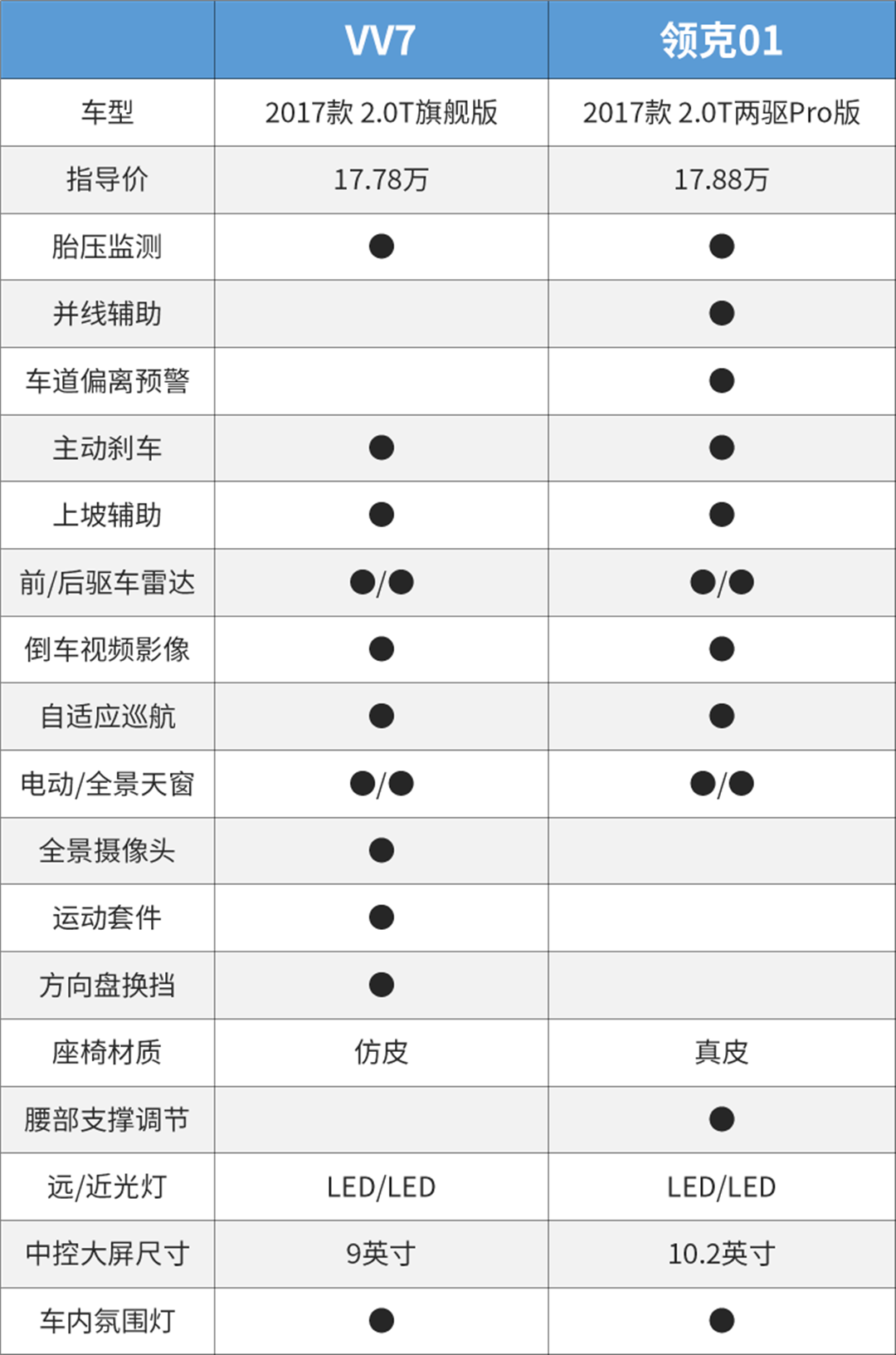 同属国产豪华身份的WEY和领克01在配置层面上自然不会吝啬自己的钱包,诸如ESP,胎压监测,刹车辅助这些路货都是全系标配,在极致运动和极致安全上出现了分水岭,换挡拨片,运动套件的加入表明了VV7是以驾驶体验为主,而并线辅助,车道偏离预警则说明01将安全进行到底的决心。
