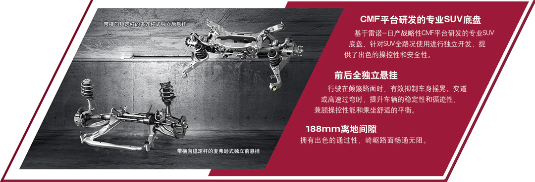 相对于很多从轿车平台上拉高摇身一变成为“城市SUV”的产品而言,逍客的CMF平台无疑更加专业,多连杆独立悬架,横向稳定杆+全框式副车架悬架刚性,在安全性和行驶稳定性上都是同级翘楚,新逍客的前后悬的下摆臂均采用了冲压和镂空的减重技术,而且后悬架还采用了镁铝合金材质的上摆臂。此外,逍客离地间隙有188mm,更好应对复杂路况。只有专业,才能更好快人一步。