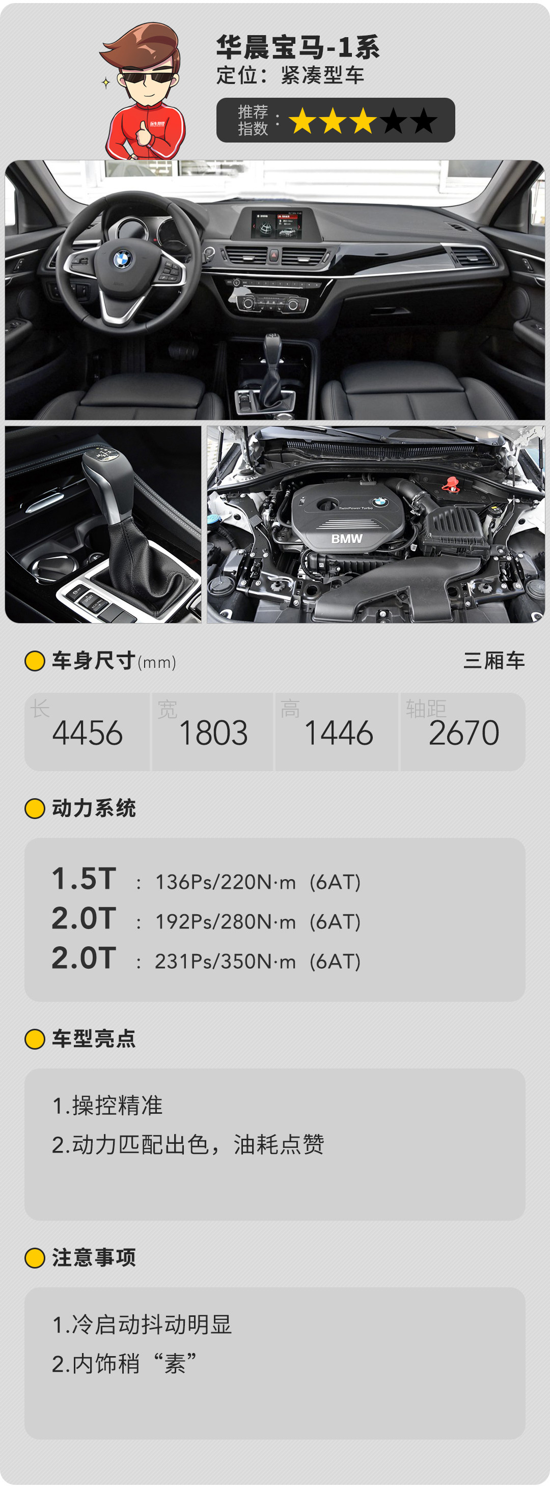从家用角度来说教授还是要给予1系肯定,内饰有着明显的家族特征,日常皮肤能接触到的地方都是软质的,这是豪华品牌应有的态度。后排空间不会感到拥挤,而且座椅和靠背特意为为中国市场而特意加厚,乘坐感很舒适。动力方面变速箱表现称职,动力够用平时开也很平顺,除了在缓慢蠕动时,发动机的抖动才会通过两个踏板感知到。