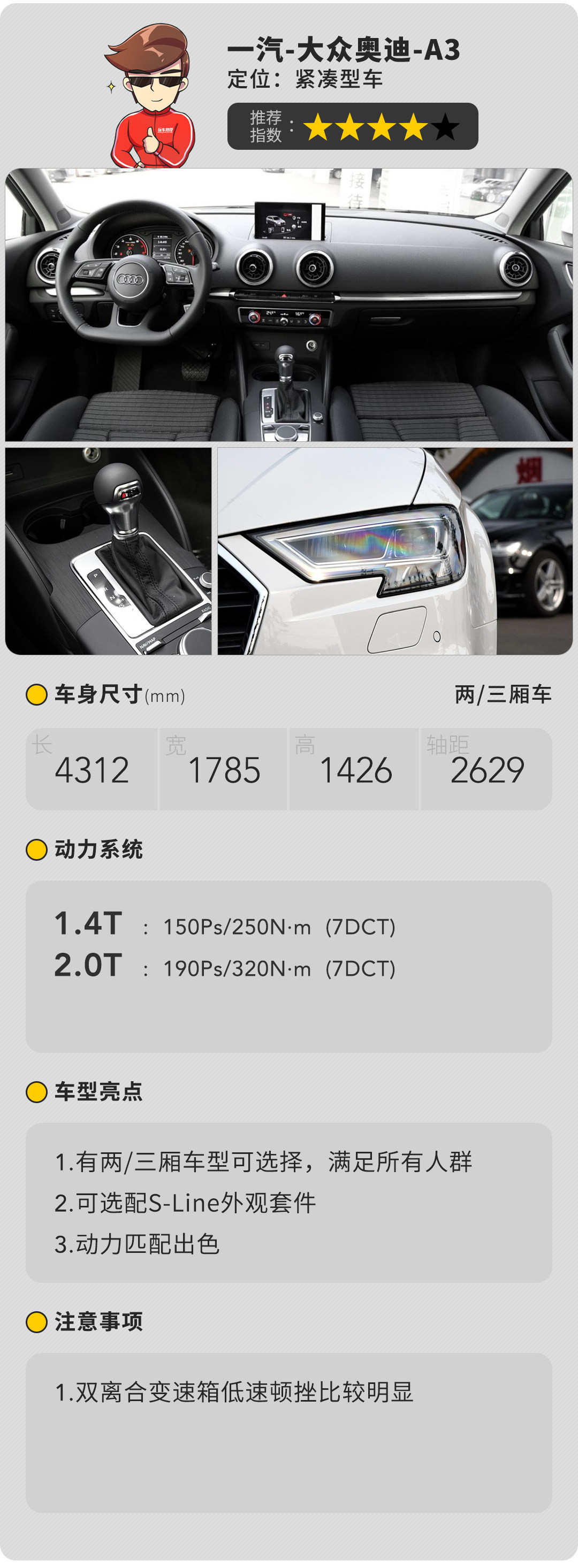 A3提供Limousine(三厢)和Sportback(两厢)两种车身结构的车型以供消费者进行选择,并且首次在国产车型上引入了S-line套件。外观不用多说,参考A4L就行了,但是内饰阁下以为也是向A4L靠拢?然而遗憾的是打开车门一切还是旧款A3的样子,大面积的留白设计虽然足够简约,但容易令人感到单调乏味。动力分别搭载1.4T和2.0T发动机,其中2.0T正是兄长A4L上搭载的那款。