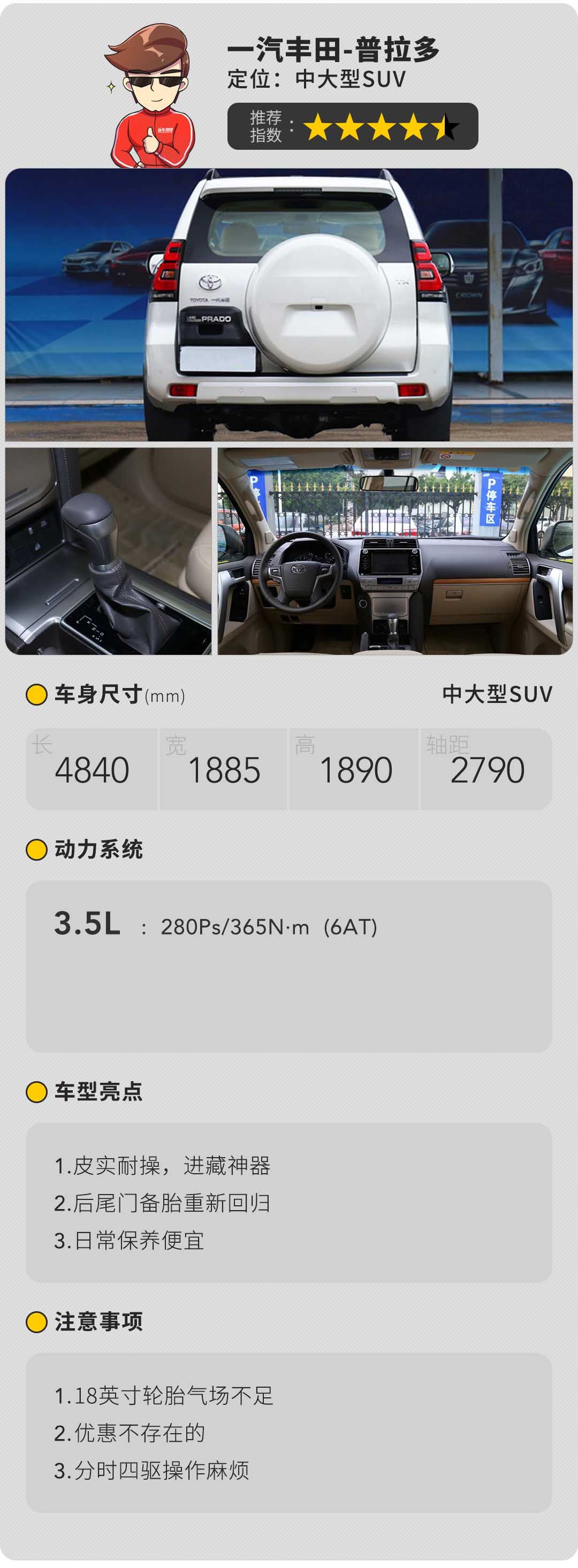 都说18款普拉多受限于“咖啡”法规,变成妥协后的产物,将全时四驱换成了分时四驱,顶配取消了后桥机械式差速锁,应付多路况时没有全时四驱来得方便那是无可厚非,可是普拉多神圣的地位岂会如此轻易动摇,10年如一日的丰田高品质就是其最大的后盾。整体外观依旧是简洁霸气的风格,外挂备胎的回归是值得普天同庆的事情,需要注意的是倒车是要预留多30厘米的空间,淡黑色木纹装配合大面积磨砂镀铬饰条,你会惊叹高级越野车也能将内饰做得如此的高档,超高的后期保值率也不失为一项理想的理财投资项目。