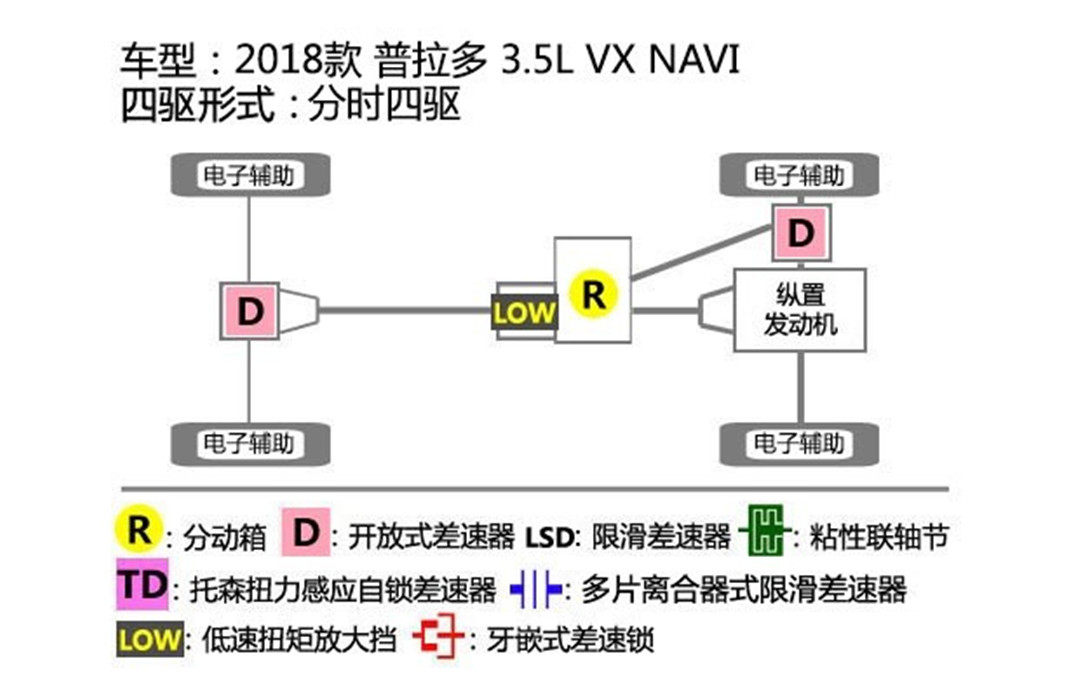 普拉多在越野圈可是享负盛名的,2018款的普拉多将全时四驱换成了分时四驱,分时四驱极限越野能力更强,可靠性更高,骨灰级越野玩家最爱,但对于初入门的新手复杂的操控让其无所适从。采用的VF4AM分动箱比旧款增加了一个换挡轴,2-4换挡增加一套同步器,当意识到车轮发生打滑,电子限滑系统也会马上做出反应,再加上低四模式下能将扭矩放大2.566倍,单前轮,单后轮,三开放式滑轮组测试都能顺利通过。