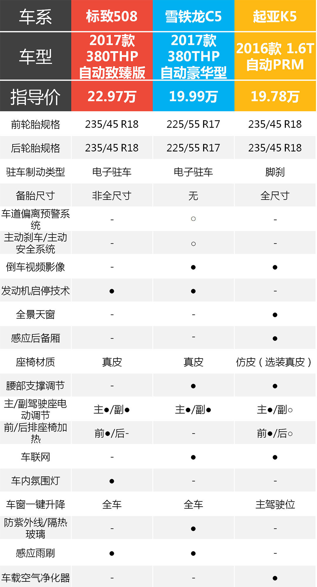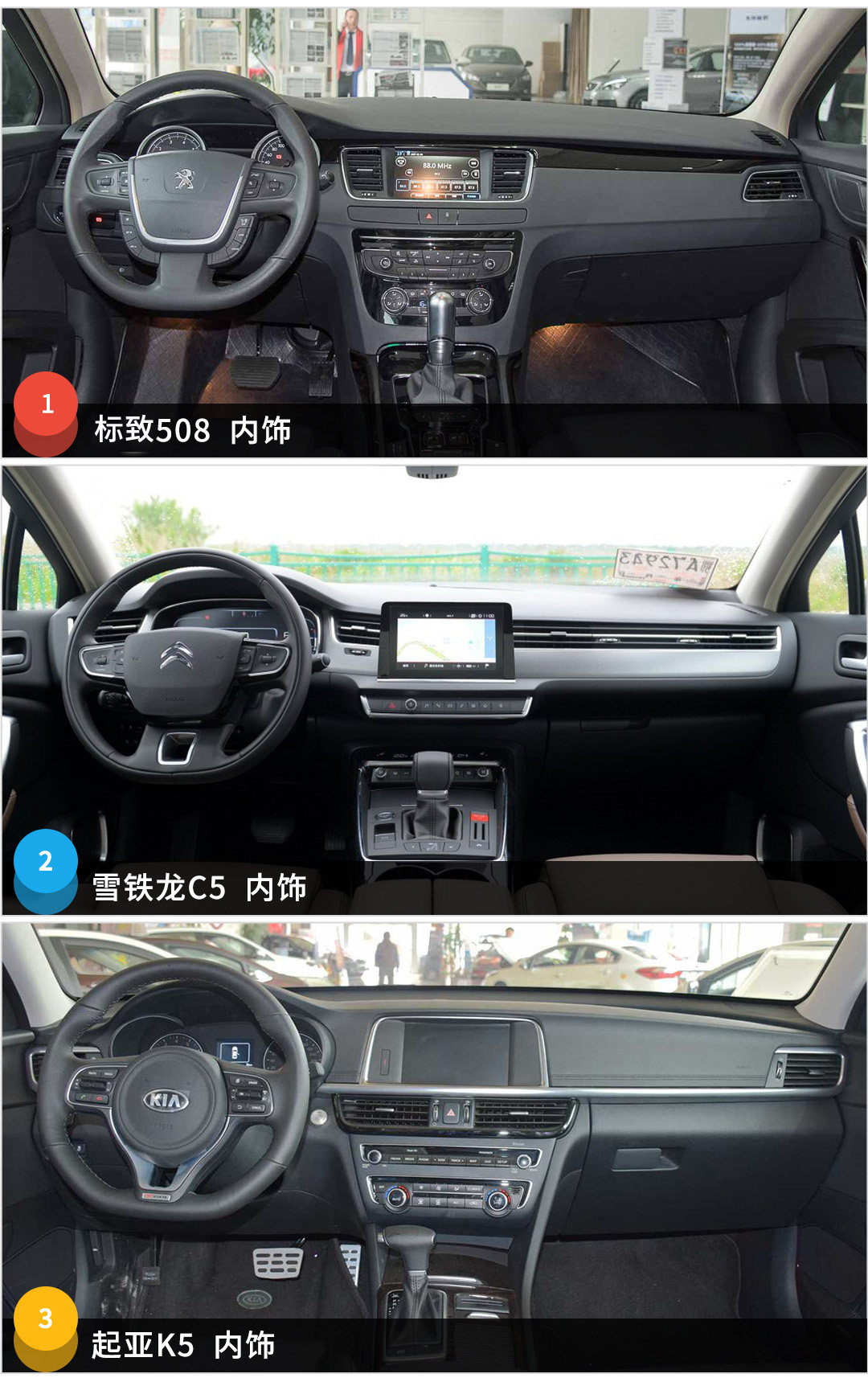 内饰方面,雪铁龙C5和标致508作为兄弟车型,部分地方有点像,尤其是挡把后方的挡位标识和两车都有三角窗(降低驾驶者的视野盲区)。雪铁龙C5的贯穿式空调出风口,和全液晶仪表盘都非常实用且有科技感。起亚K5的内饰比这两台法国车都正常,或许随大流才是发展之道,双缝线设计增加质感,K5的挡把是三车中握感最衬手,无奈的是唯独K5还使用脚刹。