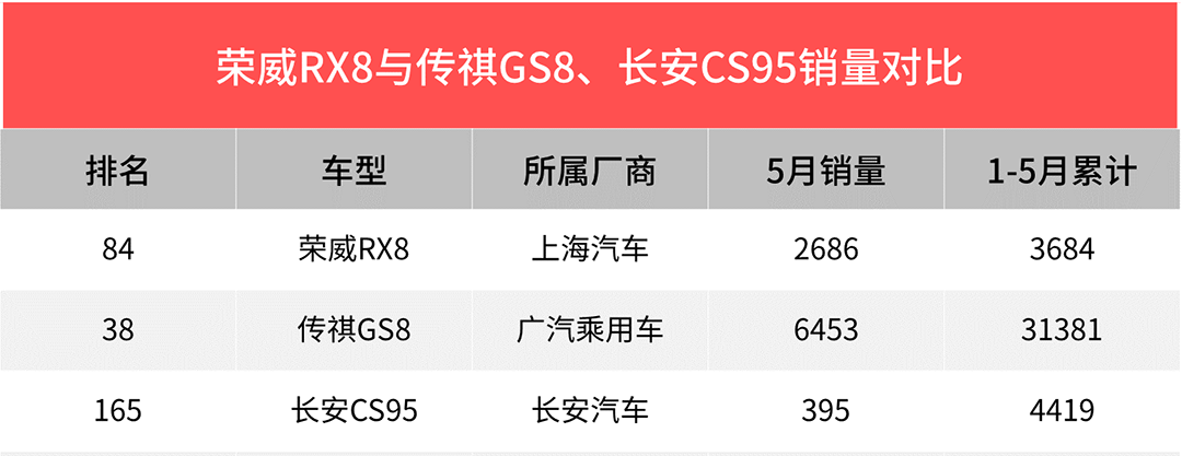 上个月RX8交出了两千多辆的成绩单,虽然跟传祺GS8相比还是显得少了一些,但已经比同价位的CS95要好上不少。