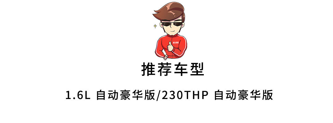 之所以有两个车型的推荐是因为发动机的不同,这个我们等等再说。豪华版的高性价比在于多加7000块钱就可以享受6安全气囊数的安全配置,还有后驻车雷达、电动天窗、中控彩屏等实用配置,值得推荐。说回动力方面,如果你想要驾驶的快感,推荐230THP自动豪华版,虽然它是3缸发动机,但136马力在2000转以后爆发明显,让你体验驾驶的快感。三缸机抖动的问题也不用担心,在车内是体验不到机舱传来的震动的;如果你还是不放心,那就选动力输出相对线性一点的1.6L吧,不急不缓,开起来比较舒服。