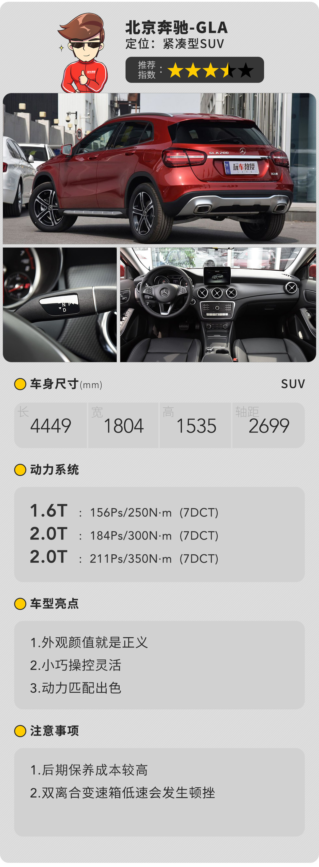 奔驰内饰营造出的豪华感,对于女性来说杀伤力是巨大的,配置上日常会用的GLA全都配备。整车尺寸不大,转弯半径也比较小,因此比较容易上手。而且奔驰相对来说故障率较小,在使用上可以省心很多。
