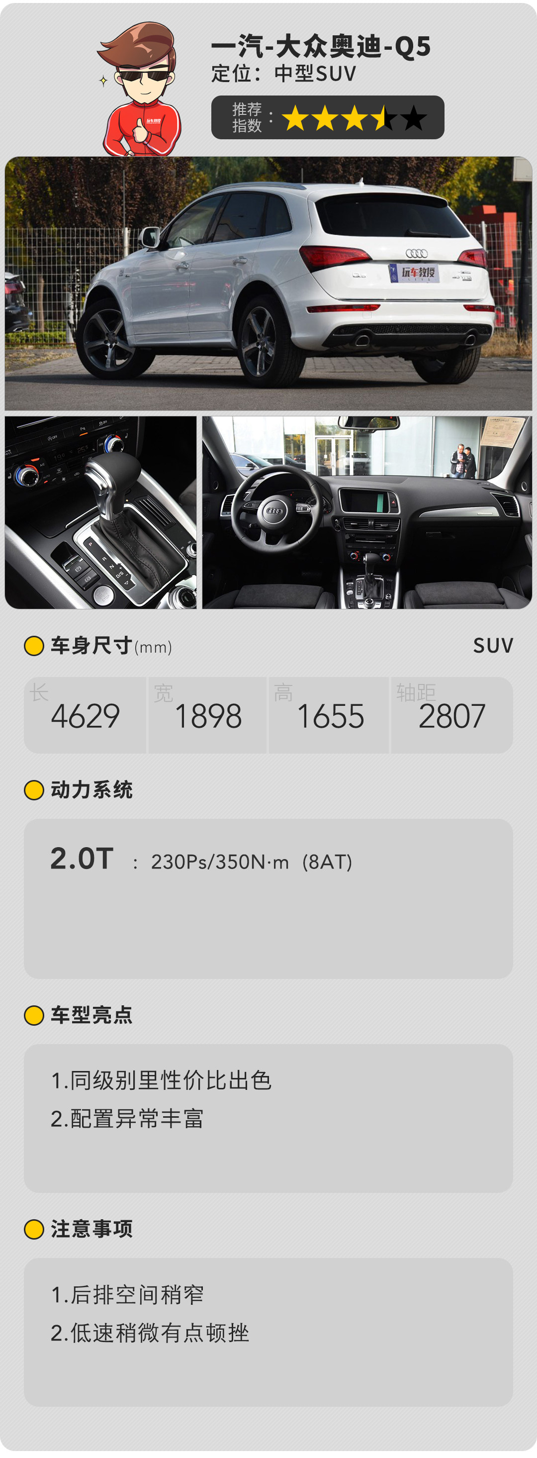 奥迪Q5适合人群很广,从年轻的妹子到成熟女性都没问题,外观内饰都很时尚,设计感强。唯一不太好就是即使到了中型SUV级别,车内空间还是有点小。另外,如果选择它的还要接受在大马路“撞脸”的可能。当然,选择Q5的人,相信自己也有一定的魅力。