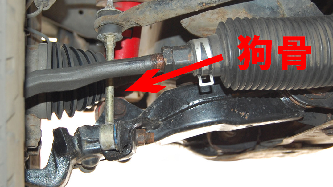 狗骨同样也是一个与悬挂系统息息相关的部件:防倾杆连杆,也就是将防倾杆与悬挂摆臂或避震机相连的纵向拉杆;因其形状与供小狗玩耍的玩具骨头相似而得名;而防倾杆连杆有时也会被称作李子串,因为其形状也有点像两个李子被一根竹子穿在一起。