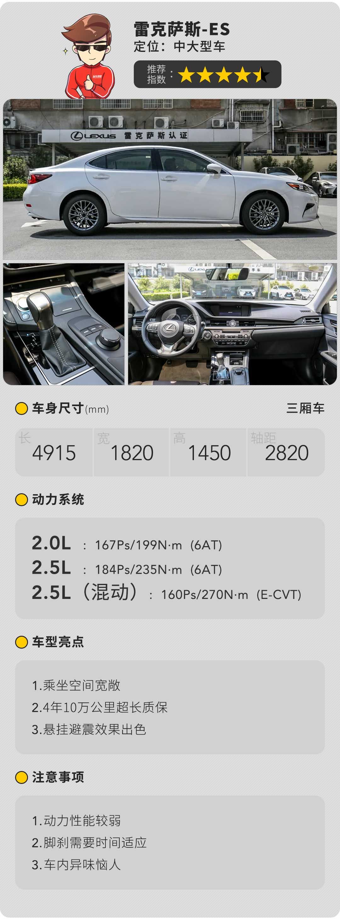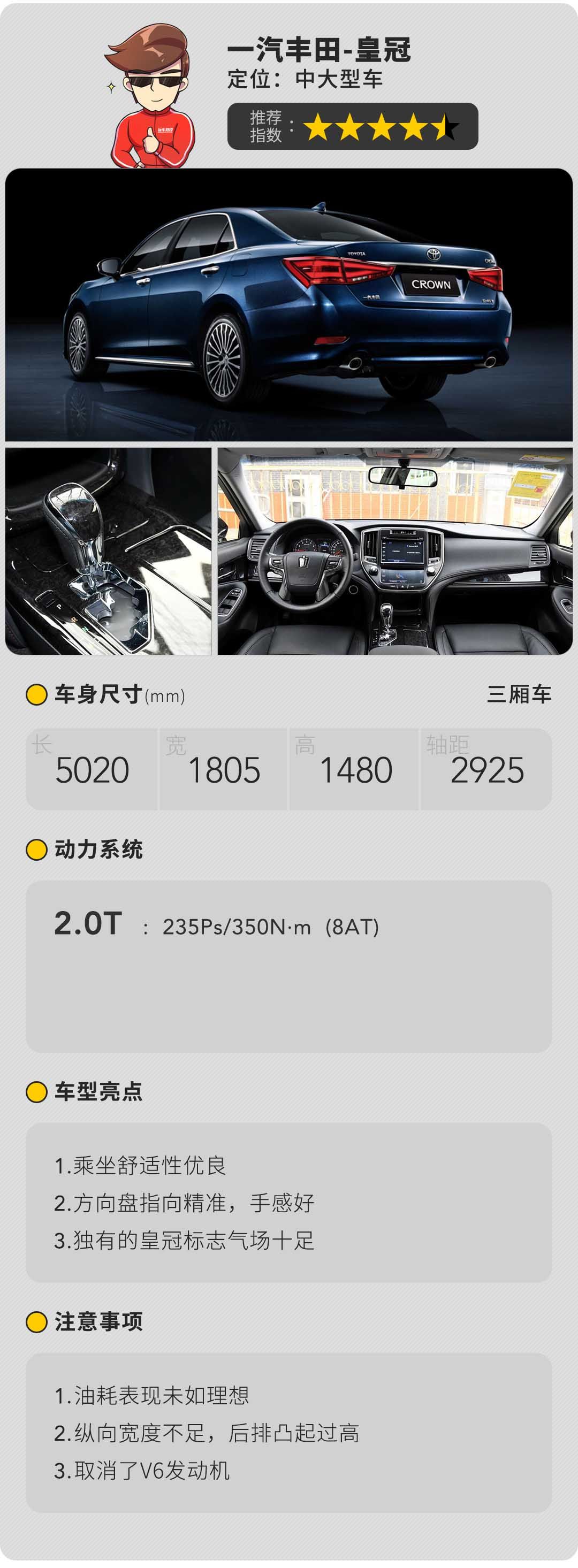 2.5L V6发动机被示为皇冠走下神坛的开始,少了两个气缸的2.0T发动机多少有点底气不足,即便少了6缸的厚重感,却多了涡轮的爆发力,采用的前双叉杆,后多连杆式独立悬架,保留了皇冠一如即往的出色行驶质感和驾驶舒适性,加上宽大厚实的座椅,整体舒适性不输日产的大沙发。长久以来积累的质量稳定历史口碑,助其保值率一直居高不下。