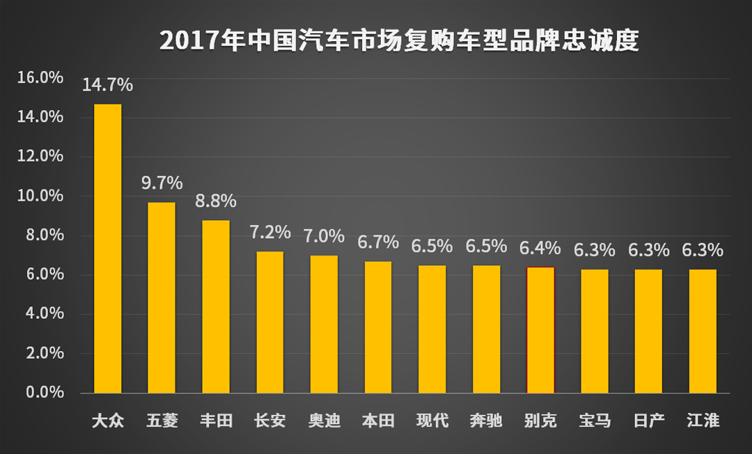 数据统计显示,大众品牌以14.7%用户复购率稳居各品牌之首,这点其实在教授的意料之中,因为大众汽车凭借其优良的用户口碑以及车型全面的布局,拥有强大的车辆保有量,品牌复购率表现突出是理所当然的。