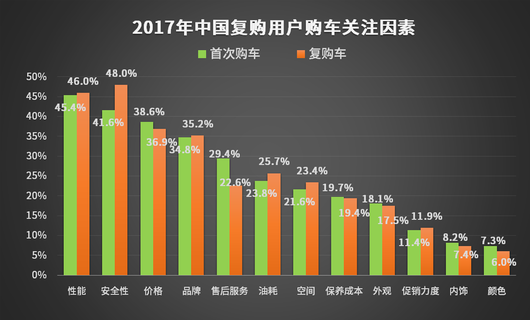 其次,复购车主在选择车型时相比首次购车所关注的因素也产生了一些变化: