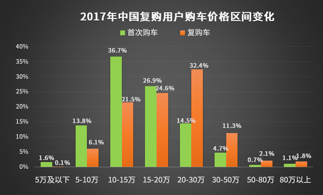 从第一辆车价格区间集中在10-15万元,到再次购车的车辆价格区间集中在20-30万元,都与消费者的收入提升、消费升级息息相关。