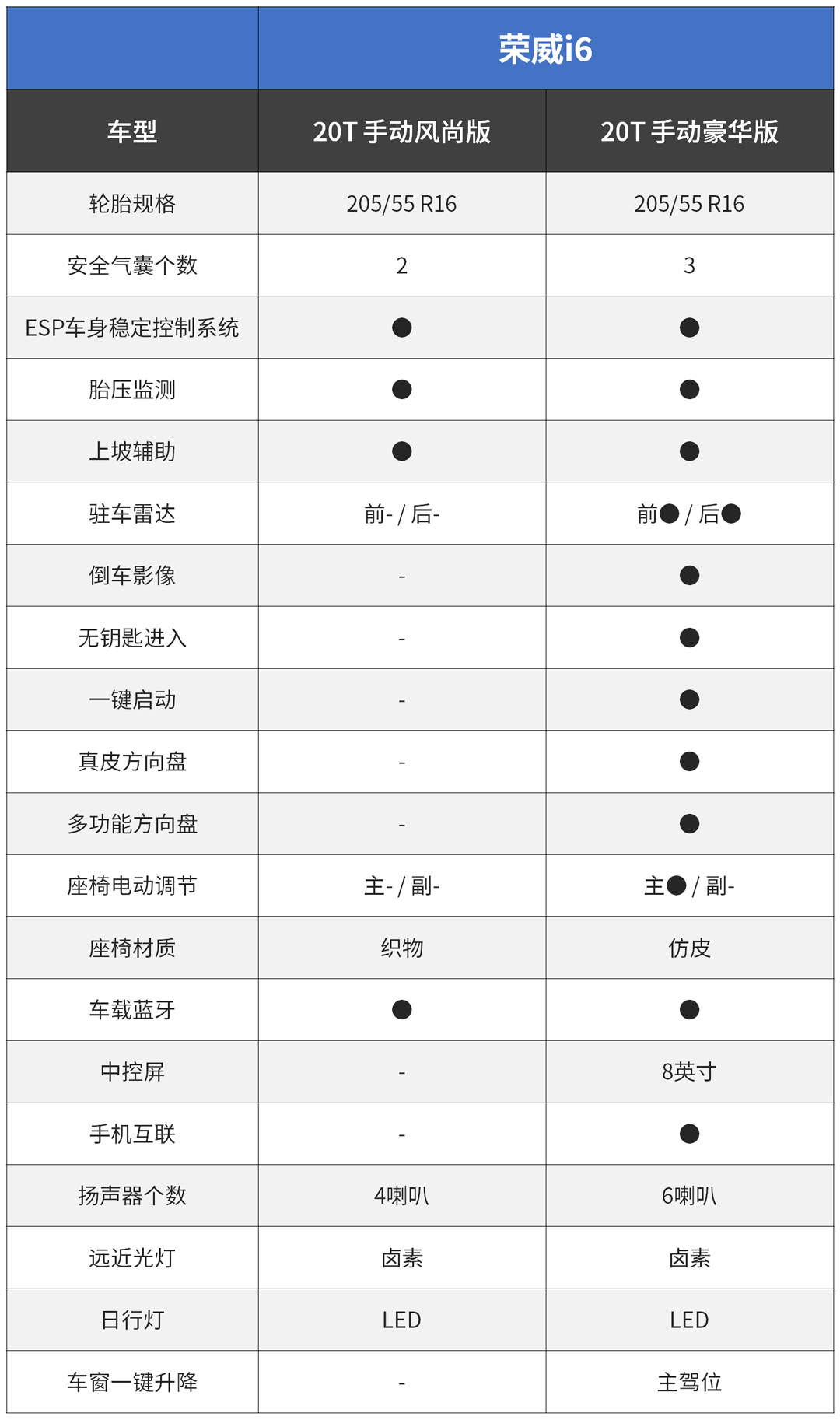 先看手动风尚标配配置:两个气囊、胎压监测、ESP、上坡辅助、织物座椅、车载蓝牙、卤素光源、16寸轮胎、手动挡,可以说非常素,基本是代步够用,没什么舒适性配置,连中控屏都没有;