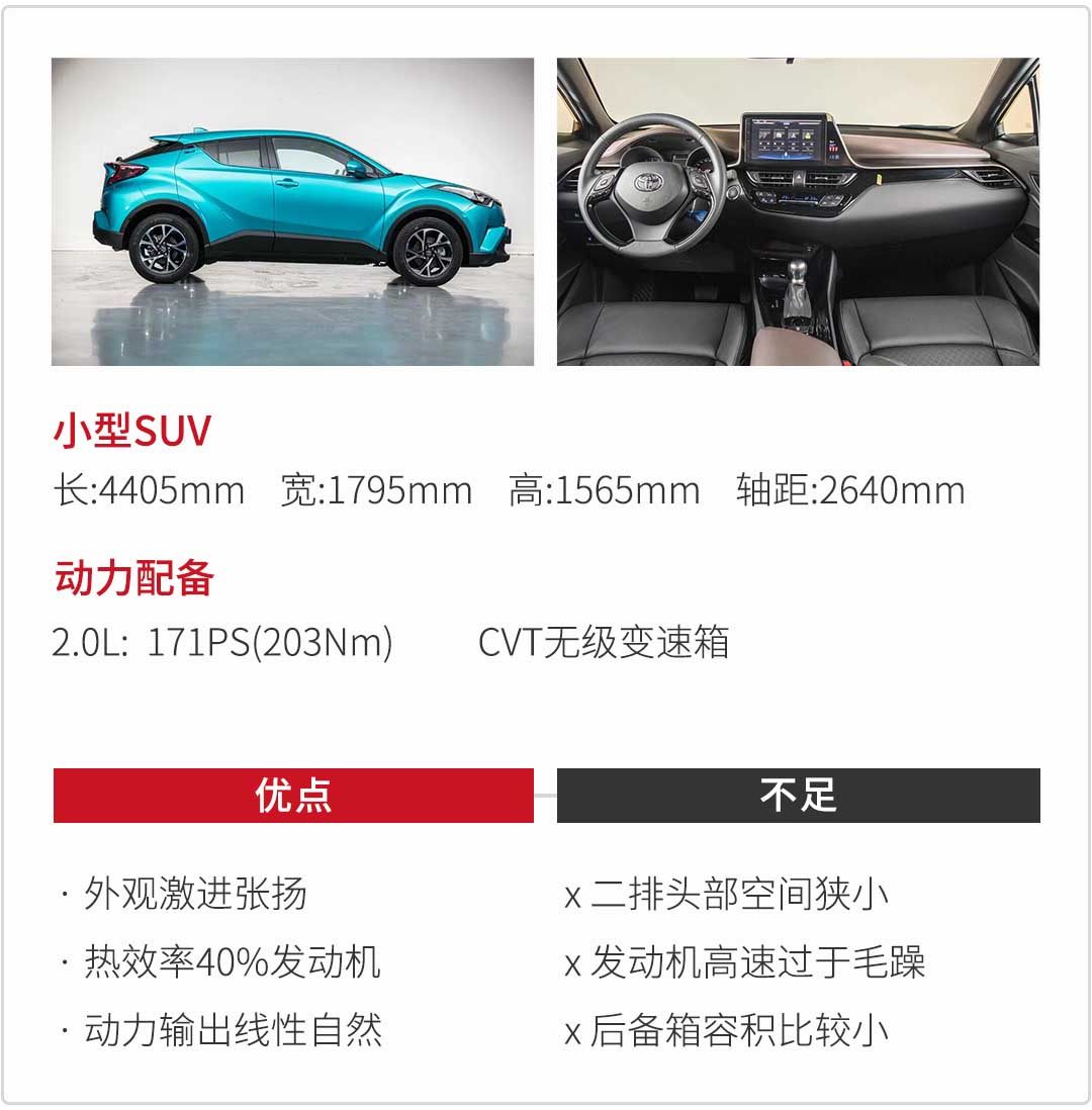如果说第八代凯美瑞是丰田颠覆中庸的改革的开始,那么C-HR就是将这场改革推向顶峰,基于TNGA架构打造下首款SUV,中央丰田logo通过狭长的通道与两侧的大灯取得联系,进气格栅被下移至底部让车头看起来整体性更强,侧面看“前凸后翘”完美身材,隐藏式的后门把手降低风阻系数的同时还营造出了一种双门轿跑的Feel,立体繁复的尾部是形面和光影美学的最佳诠释。