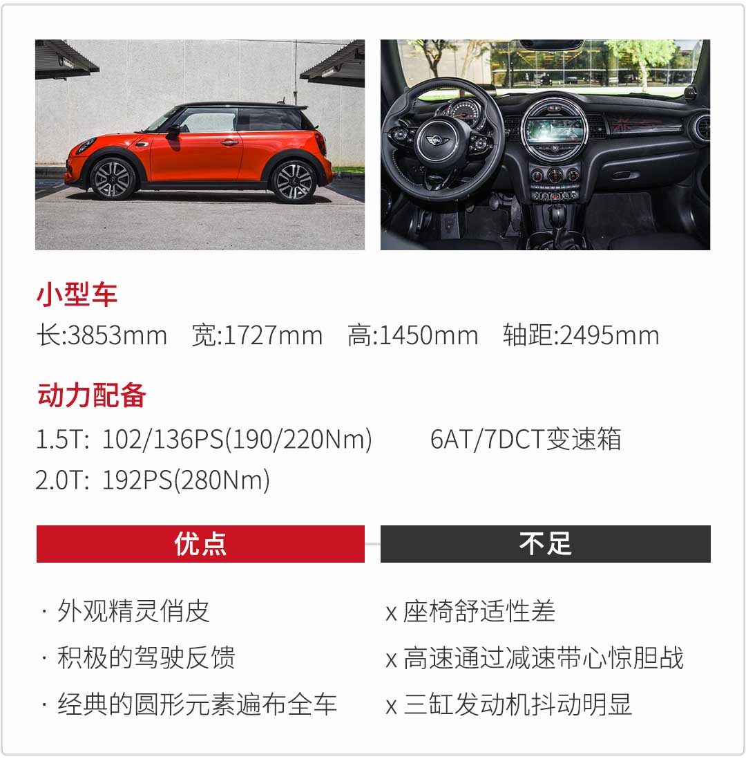 在中国mini似乎已经成为女性专用车,其实在发源地欧洲开mini都是一群大老爷们呢~~,外观糅合了个性和经典元素。如果说自由侠的圆形前大灯是可爱的话,那么mini的圆形前大灯简直可以萌化你心,可以提供多达数十种不同的车身颜色和车身配件搭配在路上你肯定找不到两辆一摸一样的mini,米字旗的尾灯强调了自己出身英伦世家的高贵身份。车内就是圆形元素开大会的氛围,圆形的中控屏幕,圆形的出风口,圆形的仪表盘。