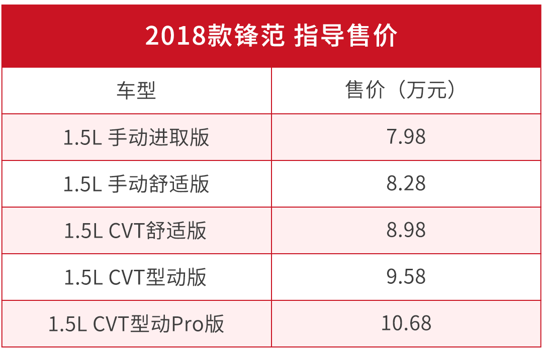 结语:作为年度改款车型,2018款锋范的改变或许并不大,精简了车型,降低了价格,加了一些配置也减了一些配置。但所幸的是,新锋范的性价比总的来说是稍有提升的,这对于预算较少的年轻消费者来说算是一个福音。而且,新锋范凭着年轻的外观造型和优于同级别的1.5L地球梦发动机的确能吸引到不少年轻消费者,是一款值得考虑的入门级家轿。