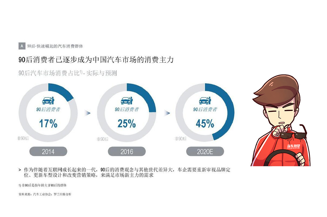 根据罗兰贝格联合今日头条发布的重磅报告——《2017年中国汽车消费关注度报告》,如今90后消费者已逐步成为中国汽车市场的消费主力,并且将在2020年初占据汽车市场的45%,而如今他们仅仅是25%,发展潜力以及发展速度值得汽车品牌们押注年轻消费市场。