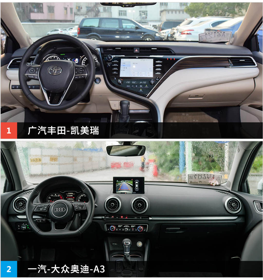通过两辆车的内饰对比可以看出,凯美瑞的内饰更有设计感,而且在用料对比老款车型有明显的提升,车厢内的舒适性配置也相对丰富。反观A3,整体设计比较简约,做工和用料都保持奥迪一贯的水准,虽然在材质用料的高级程度上略逊一筹,但仍然可以给人豪华品牌该有的质感。相对凯美瑞,A3的内饰无疑更加沉稳。
