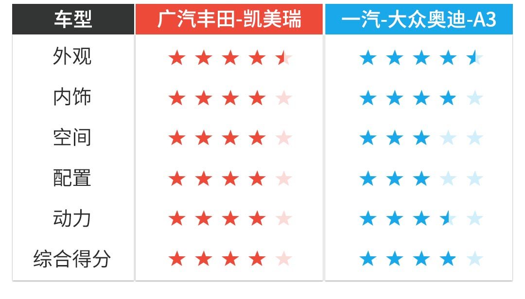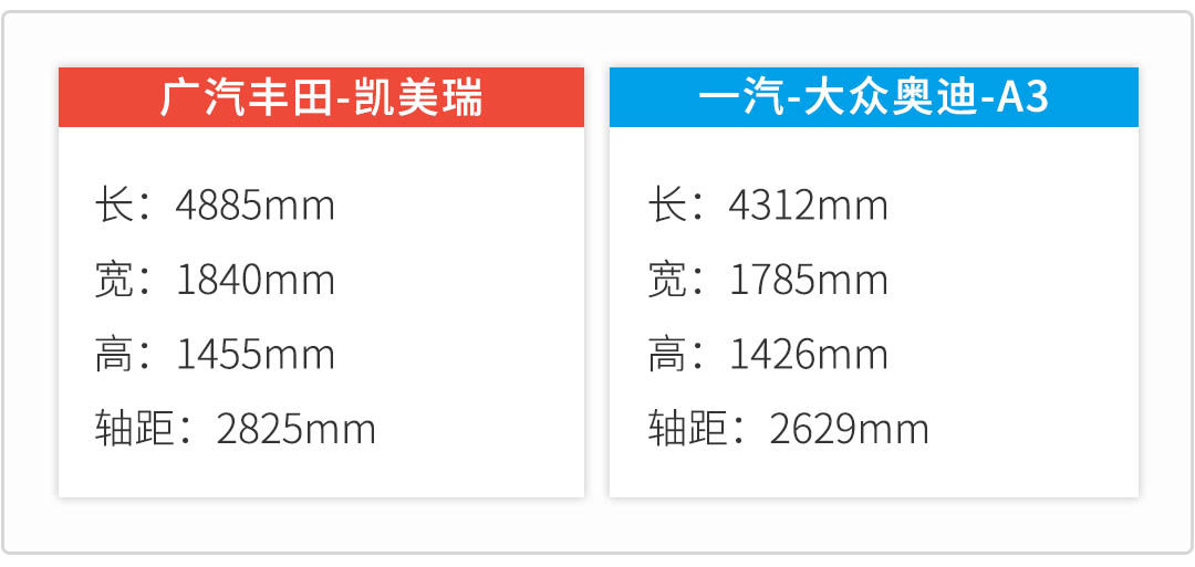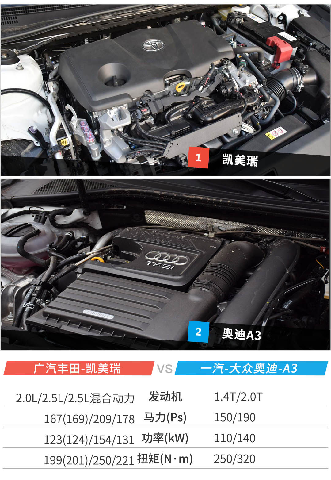 一轮比较下来,两款车的外观内饰表现还是不错的,而在空间表现方面,由于凯美瑞与A3属于不同级别的车型,因此在空间上凯美瑞是有压倒性的优势。而车厢配置的对比上,凯美瑞也要相对丰富一点,综合来说两款车在各自的级别里都是不错的选择。
