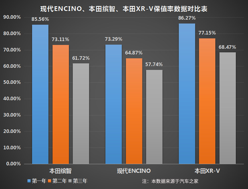 现今保值率也是众多车主买车考量的因素,那我们就来看看ENCINO这款车的保值率究竟如何,从数据显示来看,ENCINO前3年的保值率紧紧逼近其竞争对手,和XR-V基本持平,保值率还是很不错的,即使开几年再次转手还是可以卖个不错的价钱。