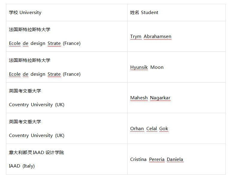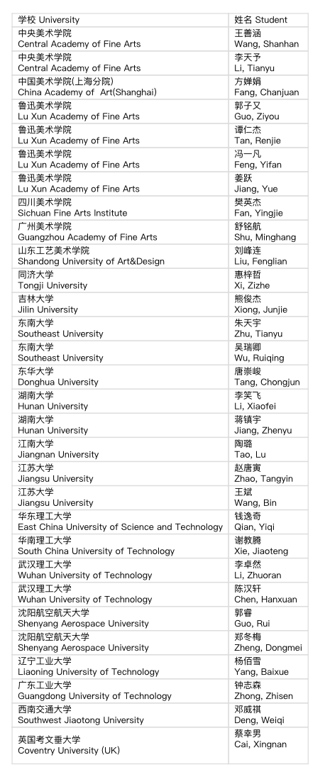 These include internationally renowned design institutes such as Pforzheim University in Germany, Coventry University in United Kingdom, ArtCenter Design Institute in the United States, Strat University in France, IED - European Institute of Design, and IAAD School of Design in Turin, Italy, Milan SPD Industrial Design Institute, Rome University and Korea Hongik University. Well-known Chinese universities and design colleges have also participated, such as: Tsinghua University, Central Academy of Fine Arts, Shanghai Jiaotong University, Jilin University, Tongji University, Southeast University, Donghua University, Hunan University, East China University of Science and Technology, Wuhan University of Technology, Shenyang Aerospace University, South China University of Technology, Lu Xun Academy of Fine Arts, Guangzhou Academy of Fine Arts, China Academy of Fine Arts, Sichuan Academy of Fine Arts, Hubei Academy of Fine Arts, etc.